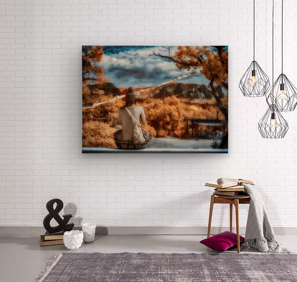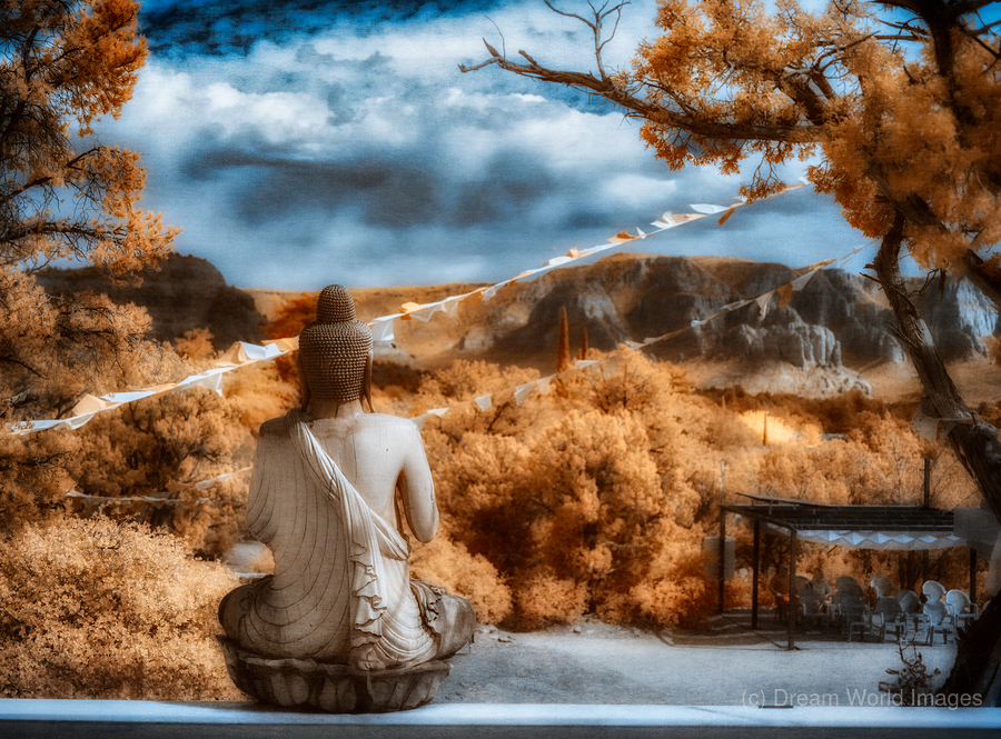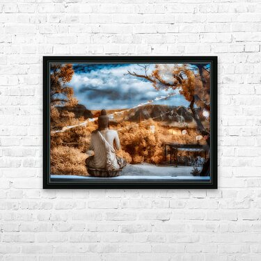 Veil of Peaceful Hues invites you into an ethereal realm where the boundaries between reality and dream dissolve. This infrared creation unveils a serene Buddha its back turned towards the observer as if gently leading one to introspection and tranquility. Nestled in a landscape that exudes calm the statue stands as a sentinel of peace draped in robes that cascade like liquid serenity. The scene around this meditative figure is alive with the warmth of autumns embrace where foliage whispers secrets of the changing seasons. Above the sky dances with an enchanting palette morphing seamlessly from deep vibrant blues into tender soft whites casting a harmonious spell over the entire composition. This confluence of elements weaves a tapestry of serenity inviting the viewer into a sanctuary of stillness and contemplation. In this mystical domain where color speaks to the soul and form transcends the temporal the artistry lies in its capacity to transform the ordinary into the sacred. Here the veil of peaceful hues is not just seen but felt—a mysterious odyssey into the heart of reflection and enlightenment awaits all who dare to look beyond the surface.