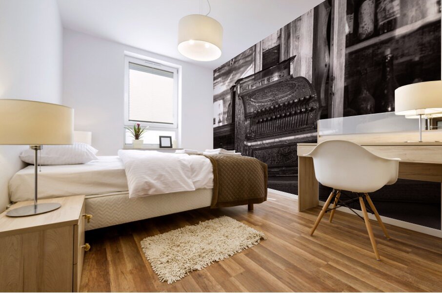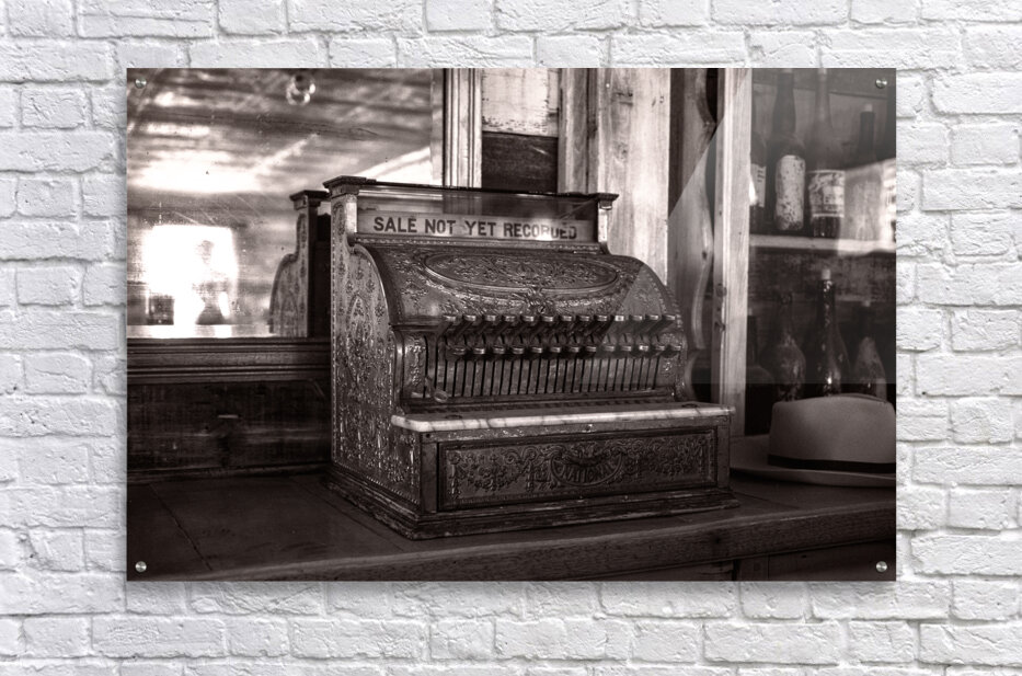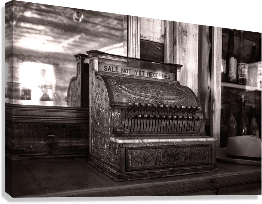 Whispered History of Gilded Keys is a captivating artwork that centers on a vintage cash register presented with an acute attention to historical detail. The piece emphasizes the intricately engraved metal facade adorned with floral motifs and elaborate scrollwork evoking the skilled craftsmanship of a bygone era. The composition draws the viewers eye to the meticulously aligned keys hinting at the mechanical ingenuity of early 20th-century design. Captured in sepia tones the artwork exudes a sense of nostalgia and antique charm. The choice of coloration not only enhances the vintage aesthetic but also imbues the entire presentation with a timeless quality. The detailed focus on elements of the cash register invites viewers to reflect on the histories and stories encapsulated within this object bridging past and present through visual storytelling.