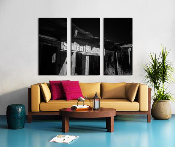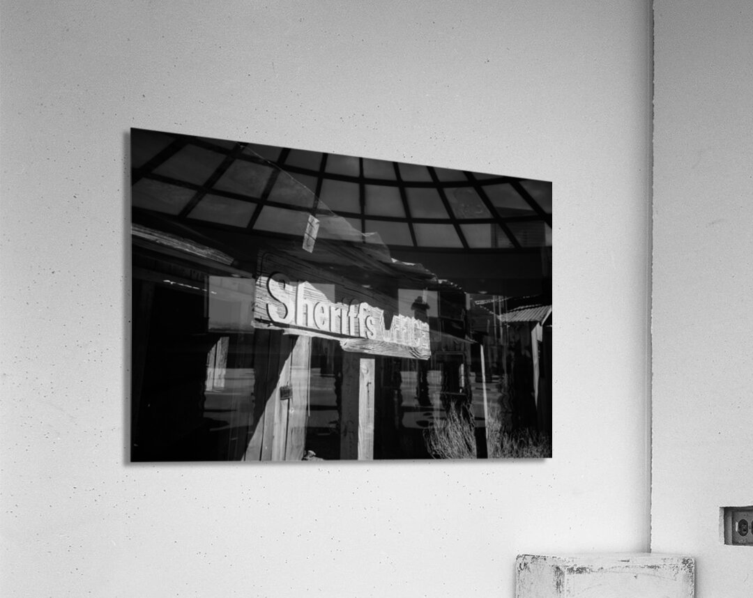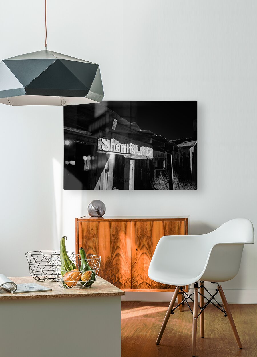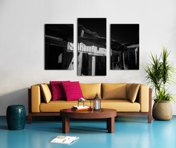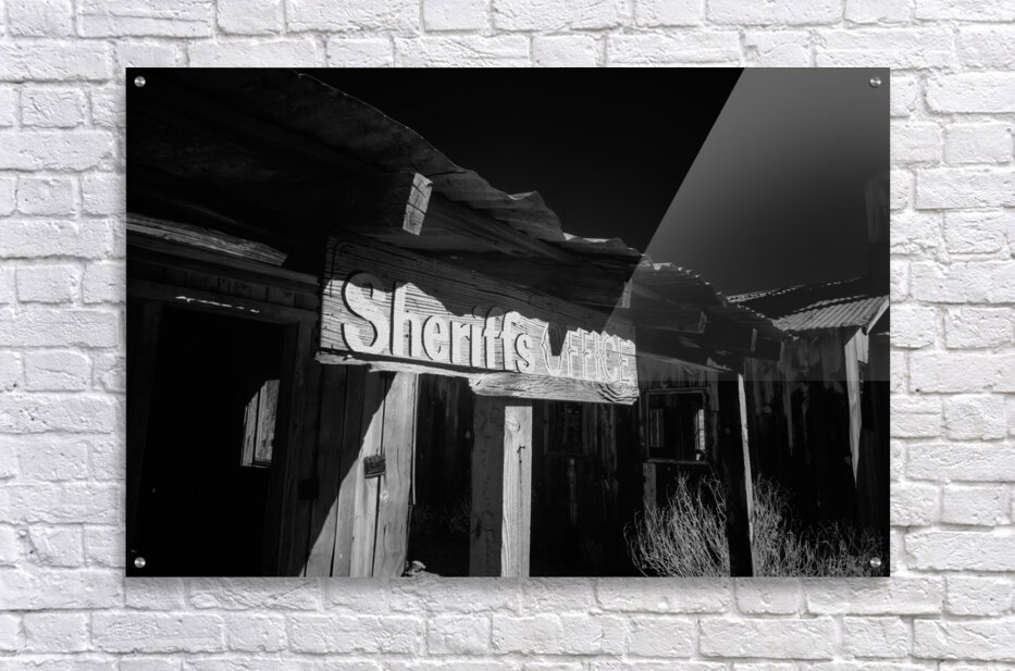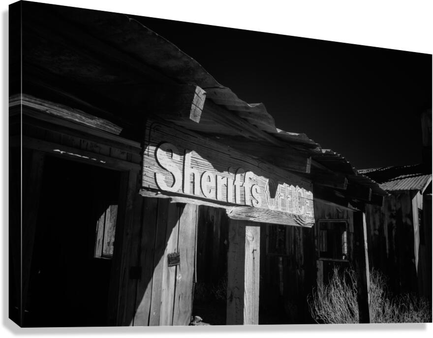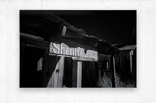 Shadows in Timber is a captivating black and white photograph that transports viewers to an old western setting. The image focuses on a vintage Sheriffs Office highlighted by a weathered wooden sign that reads Sheriffs Office. This structure with its rugged wooden beams and a corrugated metal roof exudes historical charm and nostalgia. The interplay of shadows and light across the surface intensifies the texture and atmosphere drawing the viewer into a bygone era. The photograph captures the essence of the past sparking curiosity about the stories held within the walls of such places. Its composition uses contrasts between shadow and light to emphasize the details and craftsmanship of the weathered architecture. The mood created by this interaction adds depth and intrigue to an already evocative piece.