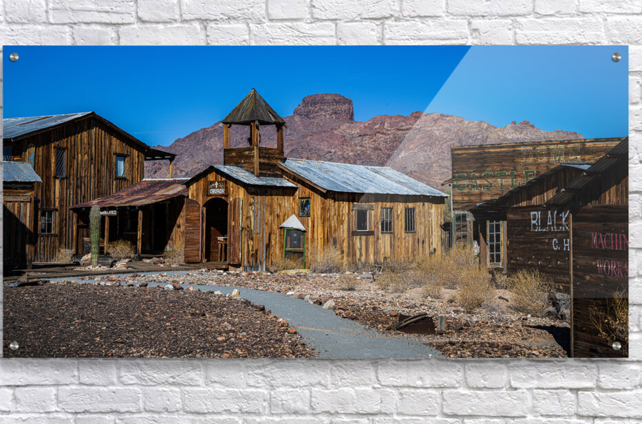 Frontier Silence Beneath Azure Skies transports the viewer to a timeless realm where history whispers through its rustic forms and desert breeze. The evocative photograph unveils an ethereal ghost town seemingly suspended in an eternal pause beneath an endless expanse of celestial blue. Weathered wooden structures crowned with tin roofs stand as sentinels of bygone days each one steeped in enigmatic tales of echoing footsteps and forgotten dreams. At the heart of this spectral pocket of civilization a chapel-like edifice rises with grace its modest belltower poised as if waiting to toll for distant souls. As your eyes wander you are drawn towards the sparse vegetation that timidly encircles the area harmonizing with the stark mountains that brood in the background—a silent reminder of natures unyielding gaze upon the ephemeral machinations of mankind. This composition pregnant with nostalgia captures a tableau where the past and present converge in a symphony of desolate beauty. The images enchantment lies not only in its portrayal of ruggedness but also in the way it mirrors the souls longing for solitude and reflection. Wrapped in the infinite embrace of azure skies this ghostly town stirs a mystical narrative about the transient yet everlasting footprints left in the sands of time inviting each viewer to connect with secrets nestled just beyond the veil of reality.