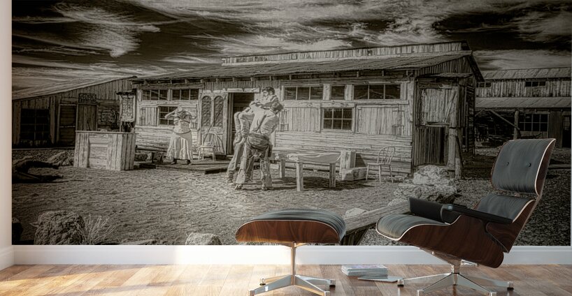 Enter a realm where time weaves its sepia-toned tapestry inviting the beholder into a narrative etched with echoes of a bygone era. This evocative photograph Frontier Clash on a Weathered Porch captures the whispers of the Wild West an era steeped in mystery and unpredictable allure. The scene unfolds upon the rustic facade of a wooden building its weathered planks textured with the stories of many seasons. Here the mundane is transformed into a portal of intrigue a setting where the fabric of time appears almost tangible. In the foreground a man clad in the attire of yesteryear stands poised in conversation or perhaps in subtle negotiation with a shadowy counterpart. His cowboy hat and chaps echo tales of rugged independence and daring exploits. Nearby a woman cloaked in a long flowing dress anchors the scene with an air of stoic grace. She lingers under the porch a silent observer or perhaps a keeper of secrets her presence both grounding and enigmatic. Above the sky broods with dense clouds a dramatic canvas adding depth to the scenes atmospheric embrace. It wraps the composition with an almost ethereal touch blending the tangible with the intangible the present with the past. Each element of this artwork invites the viewer to linger in its enigmatic embrace to ponder the unseen stories and the enigmatic relationships that unfold within this tableau of antiquity. Here the frontier spirit breathes anew captured forever in a moment of historical reflection and timeless narrative.