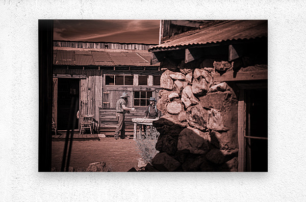 In a realm where time blurs and whispers of the past echo this sepia-toned creation emerges as a portal to another era. Conversation of Textures conjures up a rustic historical scene where two souls draped in garments of long-gone days converge in silent dialogue before a storied sanctuary. The weathered wooden building draped in history and dust stands sentinel with its corrugated metal roofs casting shadows that dance in the waning light. Intricate stonework lies in repose at the forefront whispering tales of rugged lands and the hands that shaped them each crevice and contour telling its own story. This image weaves a tapestry woven from threads of time capturing a fleeting moment of existence within an old western vista. The delicate interplay of textures and contrasts within the photograph is masterfully poised to draw the eye and spirit into contemplation. It is a mirror reflecting back to us a distant era inviting the viewer to walk amidst the echoes of its inhabitants to feel the fabric of their lives through every detail captured. Inspiration like a gentle gust of wind swept across the landscape of imagination to birth this piece channeling the soul of bygone times into present form. The process itself was marked by a unique alchemy of vision and technique a conjuring act that distills essence from shadow and light. As the viewer steps into this world each element beckons—textures of wood and stone fabric and earth—enticing with an enigmatic allure that transcends mere image breathing life back into the chronicles of forgotten tales.