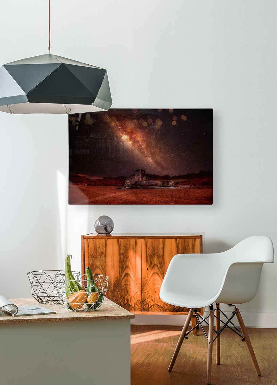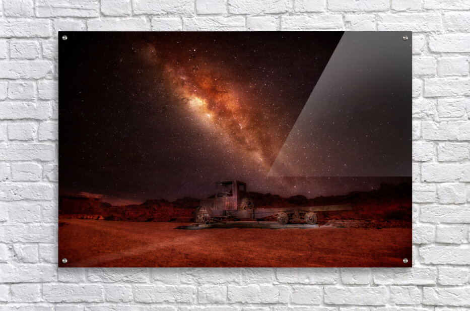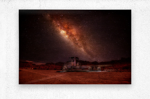 In the heart of an endless desert, where silence reigns supreme and time seems to stand still, a mesmerizing scene unfolds under the starlit canopy of the cosmos. An antique truck, a relic of days gone by, sits gracefully atop a bed of whispering sands. Its rusted frame tells tales of a bygone era, where its wheels once roamed freely, now suspended in a tranquil pause of weathered solitude. Above, the vast expanse of the universe unfurls in a breathtaking spectacle. The Milky Way, a luminous river of stars and cosmic dust, stretches across the night sky, weaving a tapestry of vibrant reds, purples, and yellows. This celestial ballet casts a serene glow over the landscape, wrapping the truck in an ethereal embrace and creating a scene both timeless and otherworldly. The juxtaposition of the earthly and the cosmic forms a poignant narrative, a dance between the ephemeral and the eternal. As in a dream, the weathered truck stands as a silent witness to the grandeur of the universe, its presence a reminder of human endeavor against the backdrop of infinite beauty. This artwork captures the essence of wonder and contemplation, inviting the viewer to lose themselves in the enigma of its mystical landscape.
