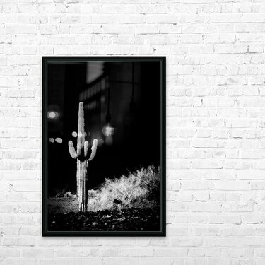 "Vertical Echoes in a Desert Canvas" is a breathtaking manifestation of nature's resilience and beauty, captured with ethereal elegance. This black and white photograph reveals the solitary majesty of a towering cactus standing sentinel in the moonlit expanse of a desert landscape. With its numerous arms reaching skyward, the cactus embodies a silent hymn to endurance amidst solitude, casting an enigmatic silhouette against the dark and mysterious backdrop. Surrounded by the whispers of ancient winds, the cactus commands attention, dominating the composition with its bold presence. To its right, a humble bush acts as a terrestrial companion, deepening the stark contrast that highlights the cactus's grandeur. Illuminated in the shadows, the intricate textures and details of the cactus are unveiled, each spine and wrinkle telling tales of time and survival. This reverent portrayal invites the viewer to ponder the secrets held within nature's fabric, offering a mystical glimpse into the silent dialogue between the earth and its inhabitants. It is a testament to the mysterious forces that sculpt our world, both seen and unseen, creating a visual symphony that enchants and provokes reflection.