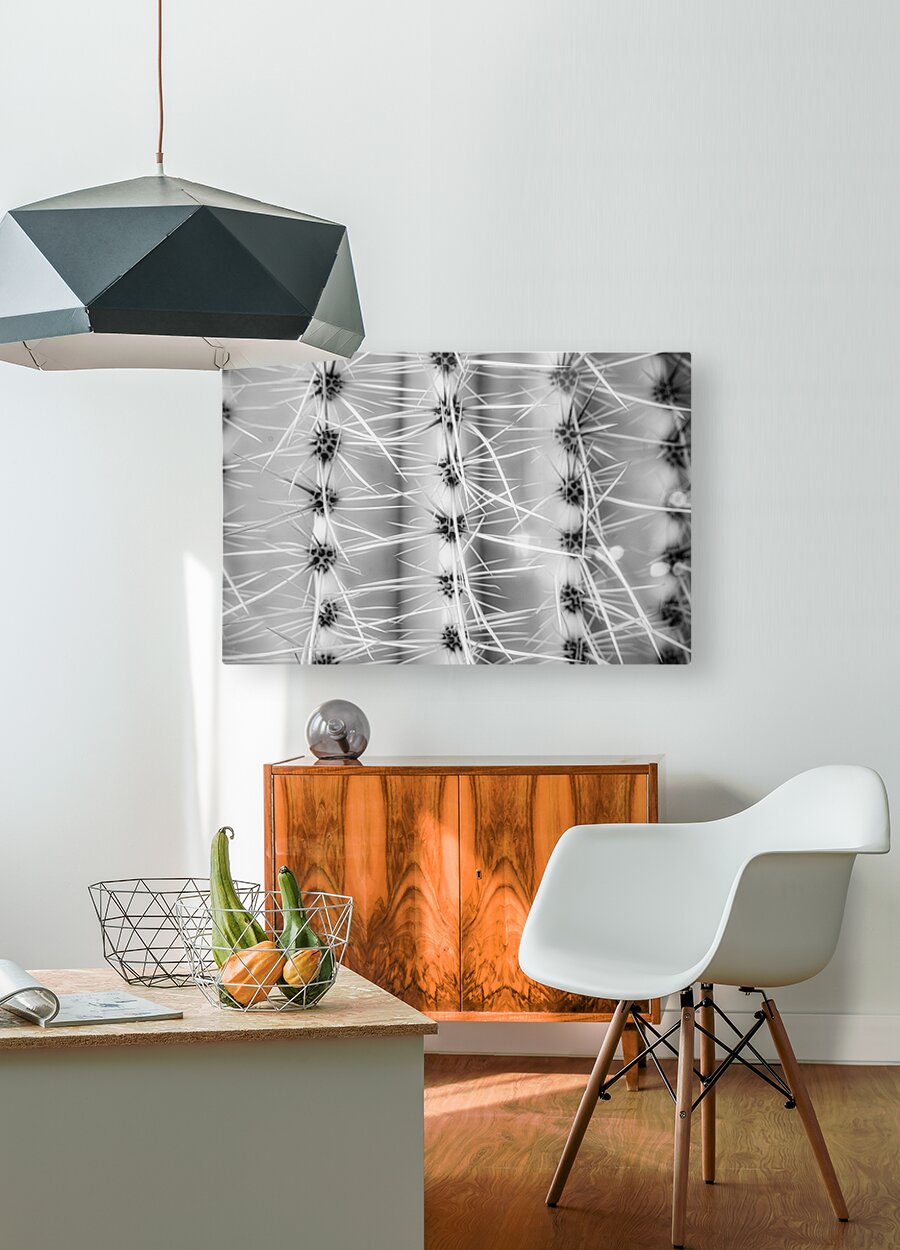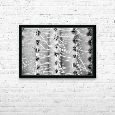 "Symmetry in Spine" invites viewers into a realm where the ordinary transcends its bounds to reveal an otherworldly spectacle of form and contrast. In this captivating black and white photograph, a cactus unfurls its hidden architectural wonders, transforming into a celestial landscape of geometric precision and abstract beauty. Each spine emerges with a crystalline sharpness, radiating with a purposeful grace from the core, drawing the gaze into a dance of primal patterns and mesmerizing symmetries. This botanical labyrinth, both calculated and chaotic, weaves a narrative of nature's inherent duality—the harmony and the tension, the fierce and the fragile. The monochromatic hues serve as a bridge between worlds, allowing shadows to play with light in a ballet of chiaroscuro. Here, the stark interplay reveals not only the tactile textures of the cactus's surface but also the enigmatic whispers hidden within its serrated embrace. The viewer is invited to ponder the infinite repetition, to lose oneself in the rhythmic echoes of sharp lines and shadowed spaces, and to find solace in the symmetrical sanctity of nature’s own design. In this visual journey, the observer is drawn into a realm of geometric wonder, where ridged columns rise like ancient sentinels, guarding secrets of desert solitude. The black and white rendering strips away distraction, distilling the essence of this natural marvel into an immersive exploration of its rhythmic patterns. Delve into the profound simplicity of nature’s architecture, as the sinuous forms whisper of an untamed beauty that transcends the boundaries of the known world. Prickly Pathway beckons with its mystic allure, inviting contemplation and introspection and offering a glimpse into the untold elegance hidden within the familiar.