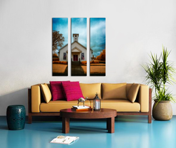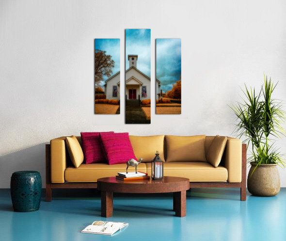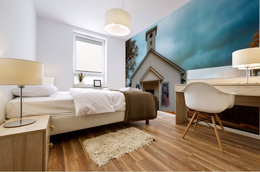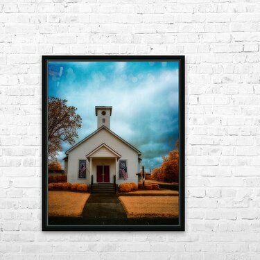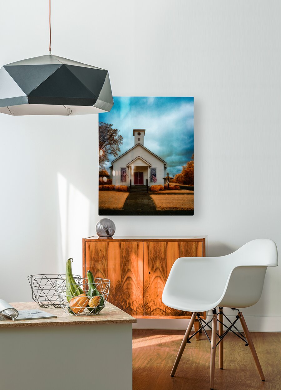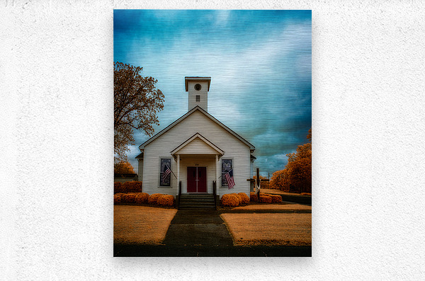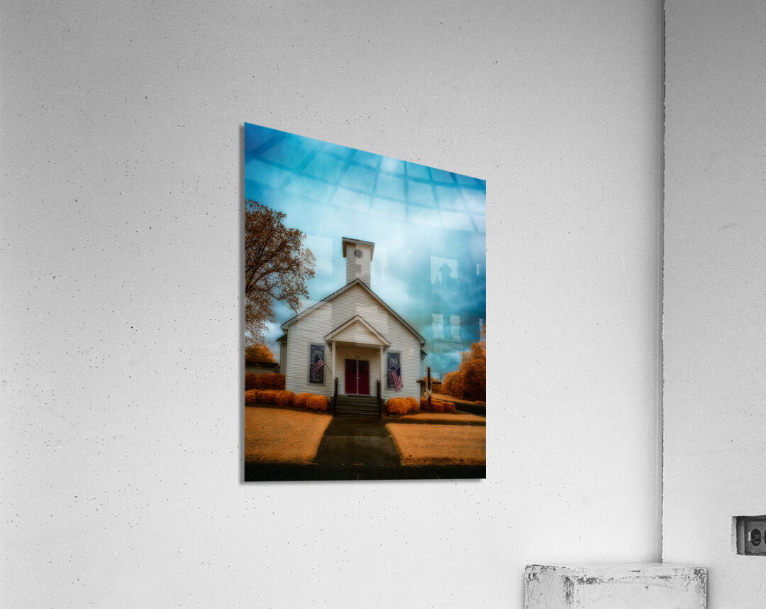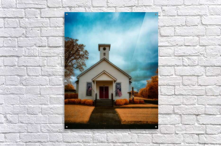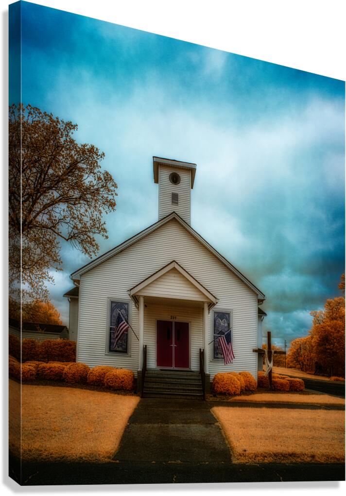 This striking infrared landscape photograph captures a classic white wooden church with its distinctive red door, set against a dramatic sky in South Carolina. The composition features American flags proudly displayed, creating a powerful symbol of heritage and faith. The infrared photography technique transforms the traditional scene into an otherworldly vision, where the sky swirls with intense blues and grays, while the surrounding foliage glows in supernatural golden-orange hues. The architectural details of the church building stand in beautiful contrast against the surreal landscape, highlighting the craftsmanship of traditional American church architecture. This fine art photograph masterfully balances architectural photography with landscape elements, creating a unique perspective of rural American churches. The infrared treatment elevates the ordinary to extraordinary, revealing hidden dimensions of light that our eyes typically cannot see. Key features: Historic white wooden church architecture Dramatic infrared sky effects Traditional red church door American flags Golden-orange infrared foliage Architectural and landscape photography blend Available as a print on premium materials including canvas, metal, and fine art paper. Perfect for religious spaces, patriotic collections, or any setting seeking to capture the essence of American spiritual heritage through contemporary fine art photography. Part of the award-winning 'Spiritual Splendor' collection by Dream World Images, specializing in infrared landscape and architectural photography."