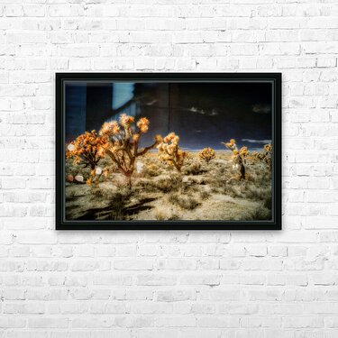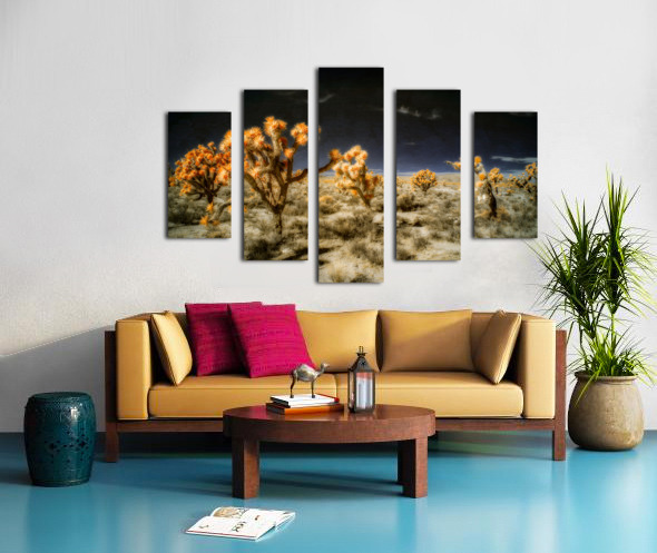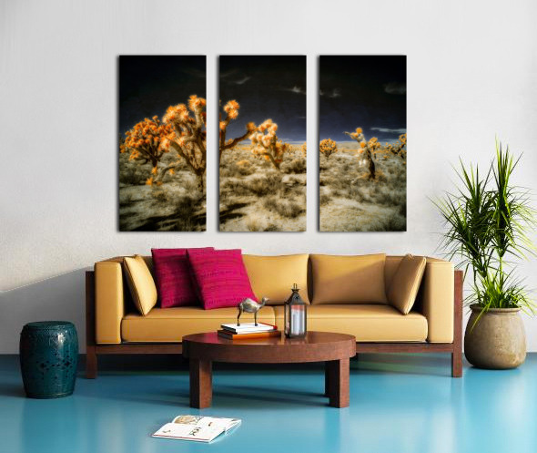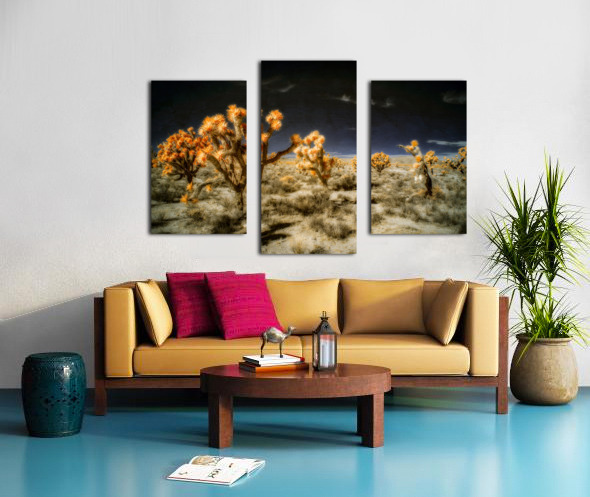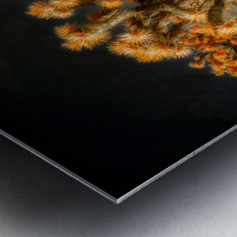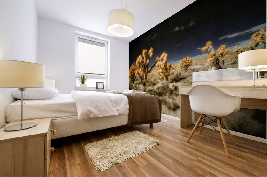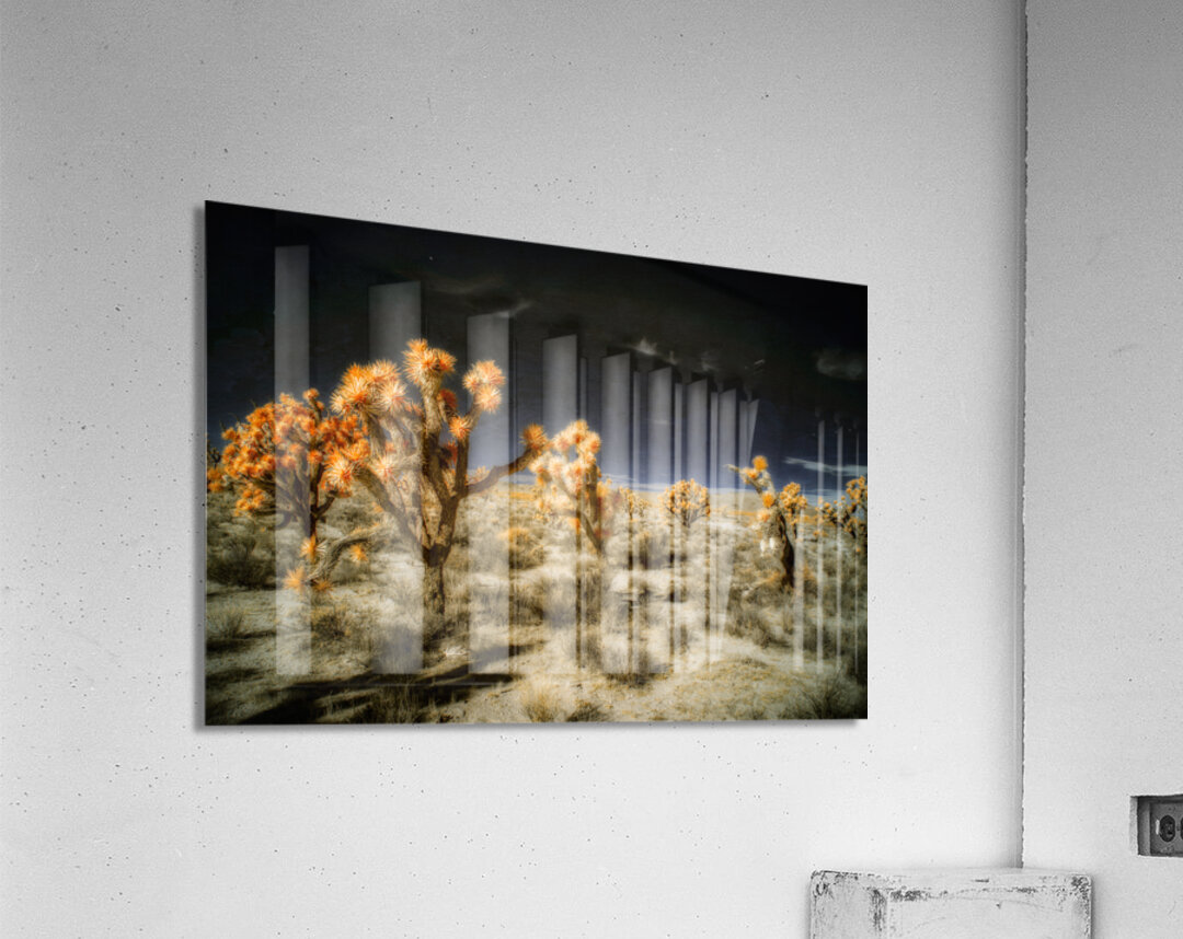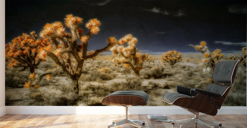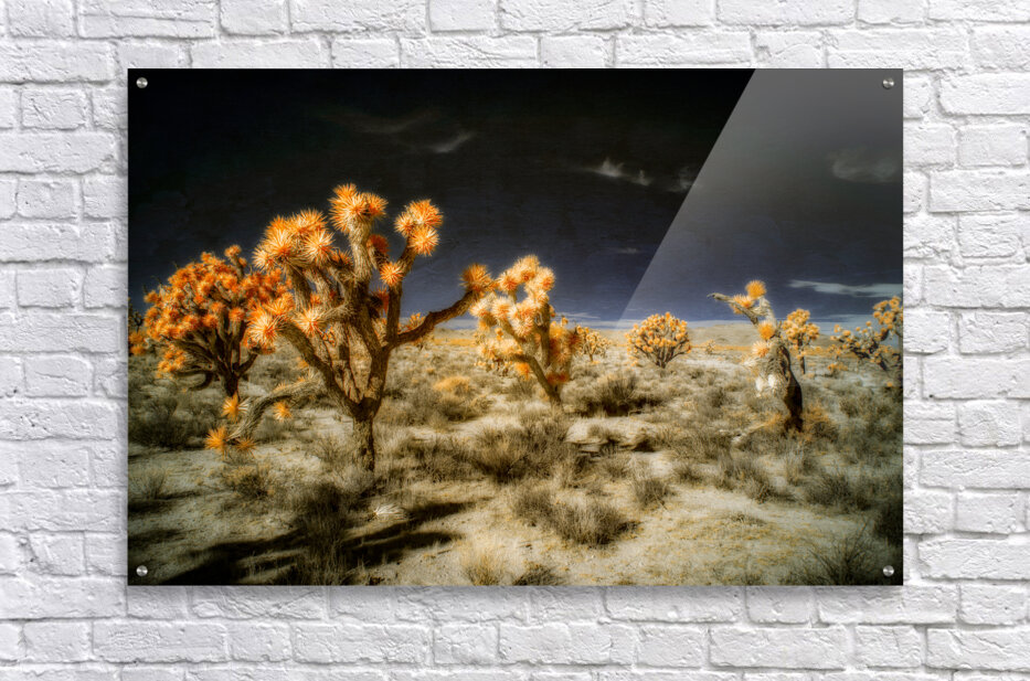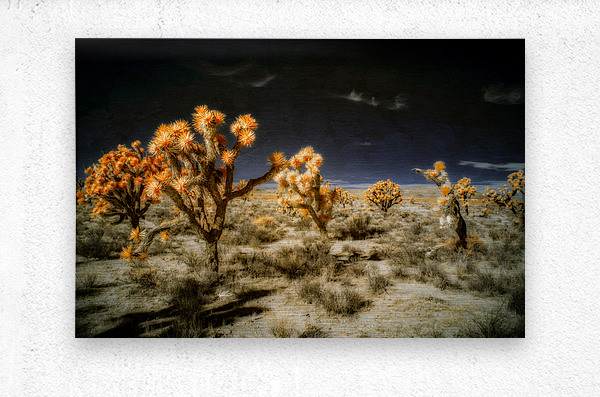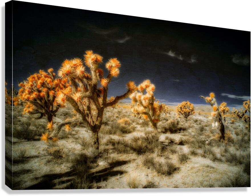 Venturing into the realm of the unseen *Joshuas Celestial Canopy* reveals a world cloaked in an enigmatic allure where the desert transforms into a breathtaking tapestry touched by otherworldly hues. The artwork captures an ethereal moment transcending the ordinary through the mysticism of infrared photography. Here the iconic Joshua trees emerge as luminous sentinels their foliage shimmering in vibrant oranges that defy earthly expectations. Above the sky broods with an infinite darkness a celestial shroud that magnifies the surreal landscape below. The ground stretches in an intricate mosaic of desert flora each shrub and tuft of vegetation rendered with exquisite dreamlike detail. The juxtaposition of shadow and light of orange against the obsidian sky creates a visual symphony that celebrates the bizarre beauty of nature’s anomalies. This piece invites viewers to traverse a liminal space to lose themselves within the alien elegance of an altered desert expanse. It challenges perceptions urging an exploration of nature’s enduring spirit as seen through a lens that captures the invisible and transfigures it into art. Allow yourself to drift into this spectral domain where the mundane dissolves into the magical and the familiar becomes marvelously strange.