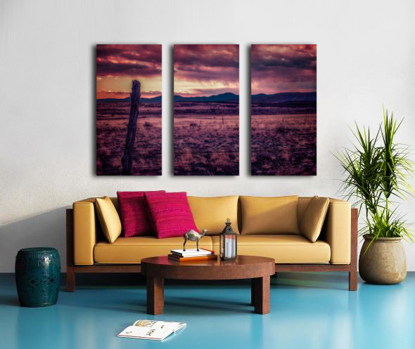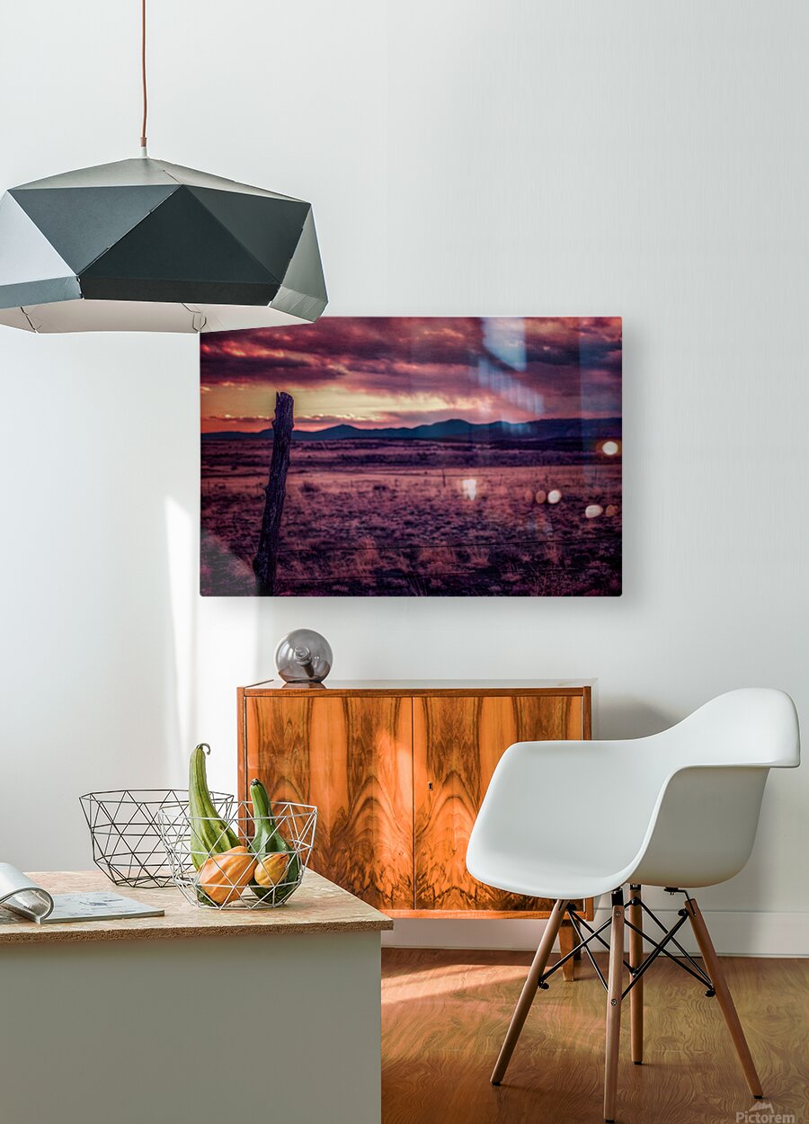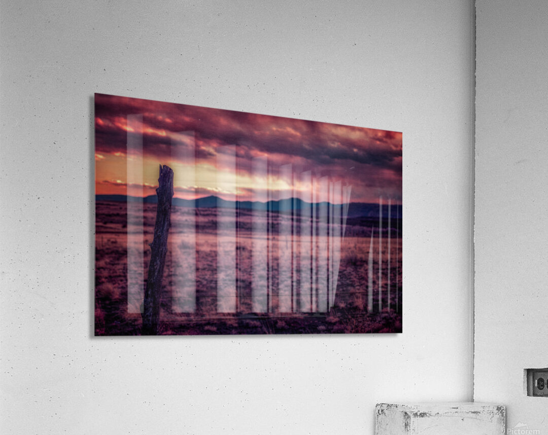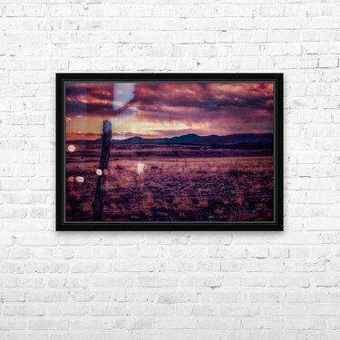 Timeless Solitude Under Painted Skies is an evocative journey through an otherworldly landscape imbued with a mystical ambiance. The scene is dominated by a rugged wooden fence post standing as a sentry in the midst of boundless open terrain. As your eyes traverse the barren earthy field they inevitably ascend towards the rolling hills and mountains that gently kiss the horizon. Above this serene expanse stretches a dramatic sky bursting with a kaleidoscope of colors—pink purple and orange—each hue cascading and intertwining like a sublime tapestry. This celestial display caught in the tender moments of either dawn or dusk bestows a surreal quality upon the tranquil environment as if time itself has paused to admire the ethereal beauty. The stark contrast between the darkened field and the vibrant splendor of the sky amplifies the sense of solitude and timeless wonderment. It is as though the landscape holds ancient secrets whispered by the winds and echoed in the silent watchfulness of the fence post—a sentinel marking the threshold between the earthly and the divine. This photograph invites viewers to lose themselves in its mystical narrative where every glance reveals another layer of enigmatic beauty and infinite tranquility.