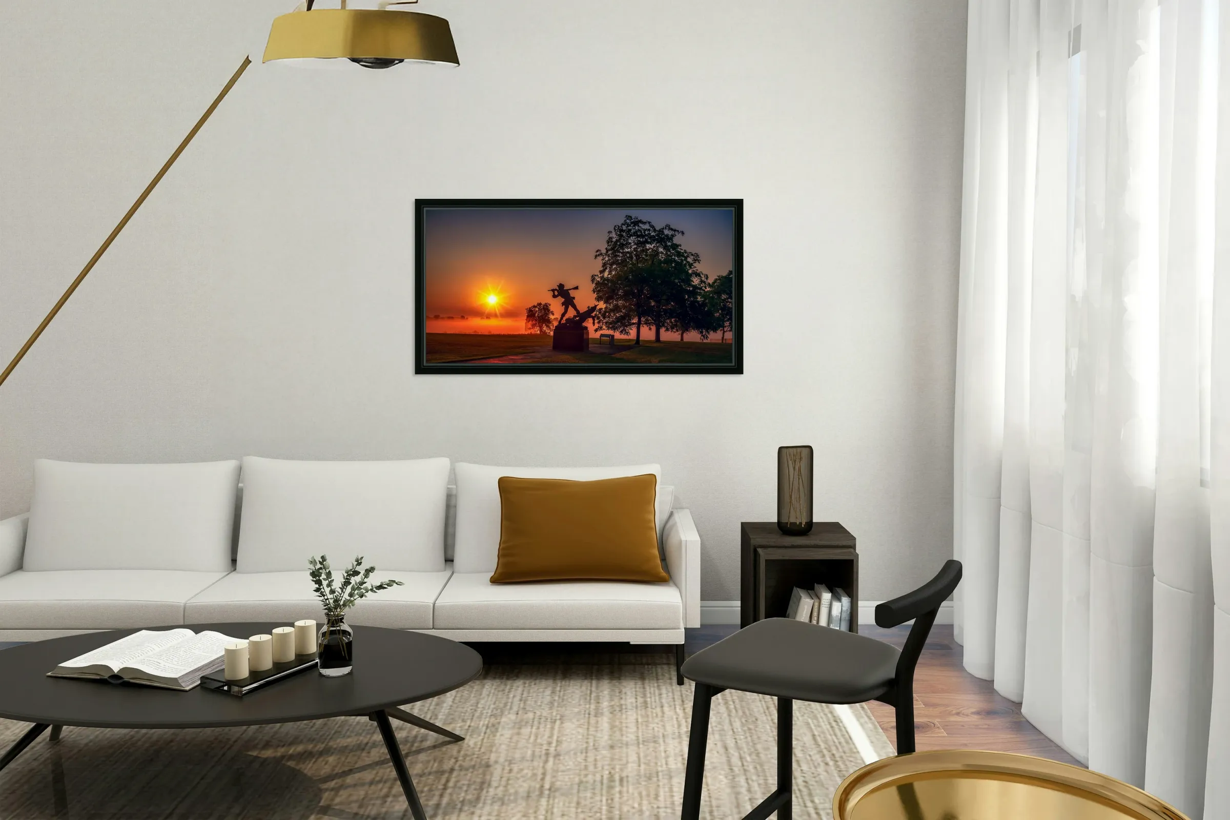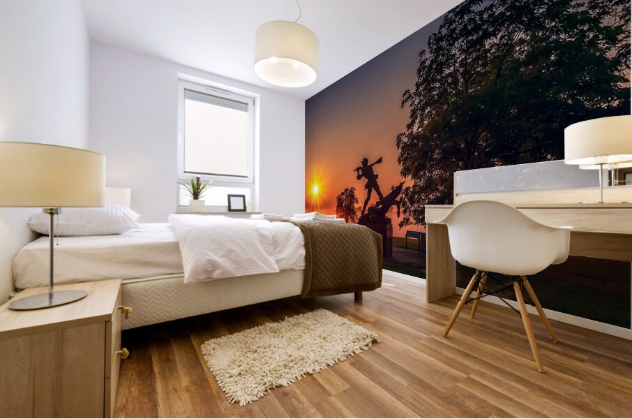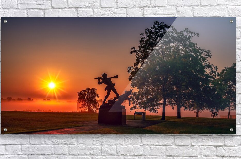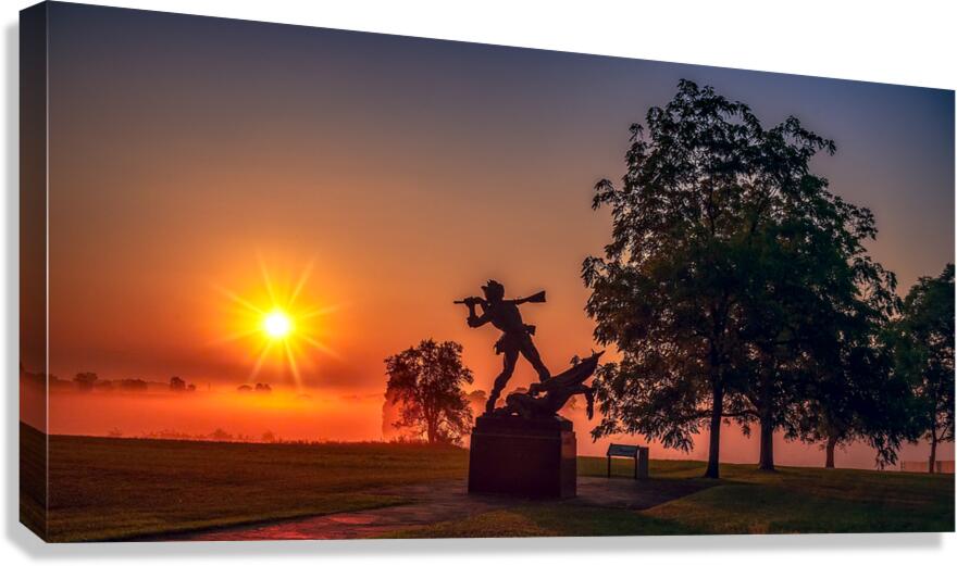Sun breaking through the fog at dawn on the Gettysburg Battlfield.