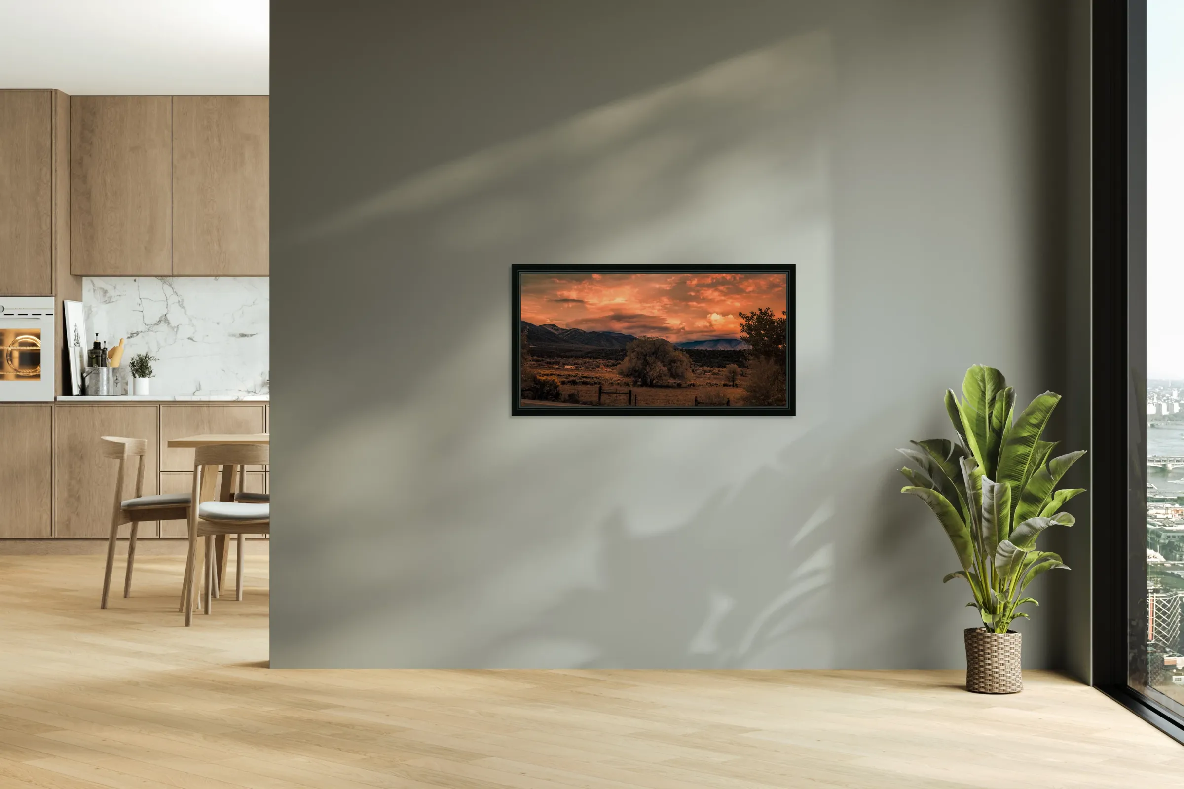 Dive into a realm where natures tranquility and the primordial force of fire converge. This striking landscape photograph beckons viewers into a serene countryside juxtaposed against a dramatic and enchanting sky ablaze with fiery hues. In the foreground a sprawling field with sparse vegetation embraces a lone majestic tree standing resolute with its full foliage—a solitary guardian amidst the expanse. Venture further into the composition where a humble fence lines the middle ground leading the eye toward a congregation of trees seemingly whispering secrets of the earth beyond a range of rolling hills or low mountains looms shadowed silhouettes under the vibrant cloud-streaked sky. The heavens are painted in a mesmerizing symphony of oranges reds and yellows each cloud a brushstroke of creation against the infinite canvas. The interplay of light and shadow earth and sky crafts an atmosphere that is vast and intimate evoking a sense of endless wonder and profound peace. The intense warmth of the color palette ignites a sense of awe transforming the natural beauty into a mystical moment frozen in time. This is a timeless testament to the untamed allure of nature an enigmatic glimpse into the soul of the wilderness where solitary vigil is kept amidst the fiery twilight.