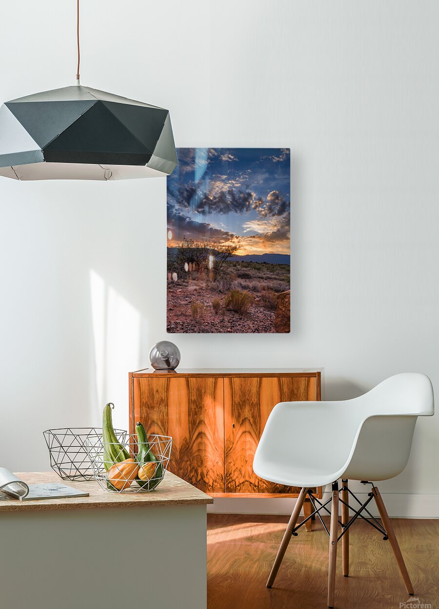 Radiance Unfurled Over Rocky Plains beckons the viewer into a realm where earth meets sky in an ethereal embrace. My wife and I were driving back from the store in Cottonwood Arizona when the sky started to light up in the most spectacular way. We couldn’t resist so we pulled over onto a dirt road to capture this image. This captivating photograph unveils a desert landscape cloaked in the mystique of twilight. In the foreground rugged dry shrubs and the rocky terrain stand as silent sentinels guardians of an ancient and untamed wilderness. A solitary tree resolute against the encroaching dusk reaches skyward framed by the distant shadowy grandeur of mountains that whisper secrets of time immemorial. Above the heavens unfold in a mesmerizing dance of light and shadow. Dramatic clouds gather at the horizon woven with threads of golden and fiery orange as the sun surrenders its radiance to the encroaching night. Piercing through this celestial tapestry luminous rays of sunlight stream defiantly through the cloud cover casting a divine glow that pierces the deepening blue canopy. This interplay creates a powerful contrast evoking a sense of wonder and the infinite. The piece captures the transient moment when day bows to night encapsulating the profound beauty and mystery of natures fleeting spectacles. Its an invitation to wander into the wild heart of the world and to lose oneself in the enigmatic beauty of the unseen. Radiance Unfurled Over Rocky Plains stands as a testament to the awe-inspiring duality of earth and heavens encouraging the beholder to find their own place within this eternal saga.