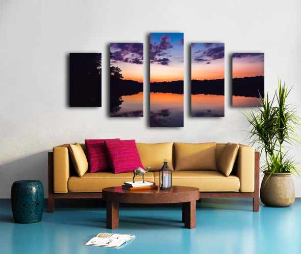 A serene lake perfectly mirrors the dramatic purple and orange sunset sky creating a natural symmetry between heaven and earth.