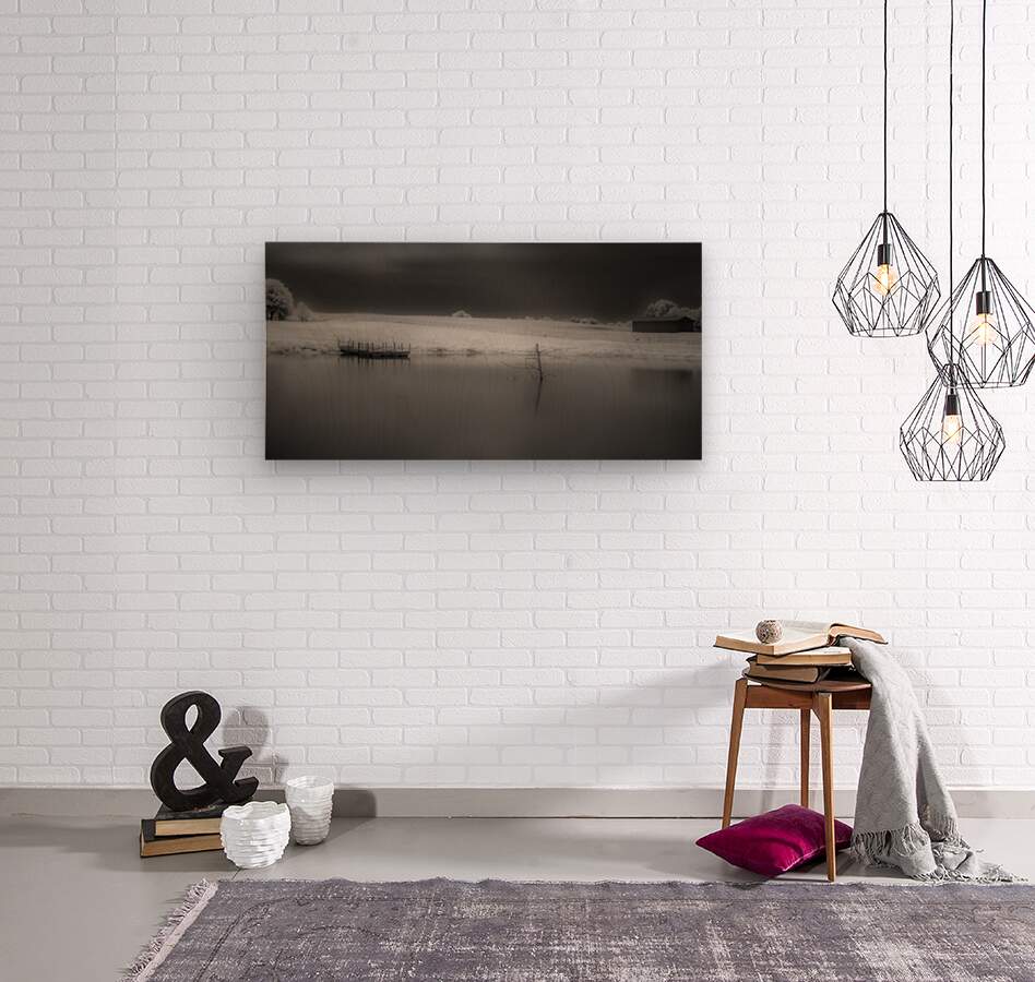 Step into tranquility and peace with the captivating artwork Quietude by the Lake. Immerse yourself in the serene monochrome landscape where a calm bo...[+]