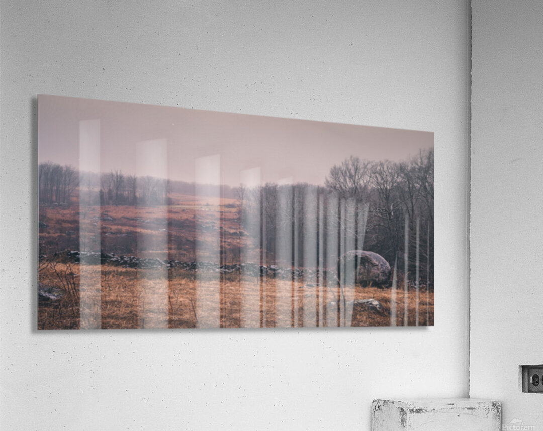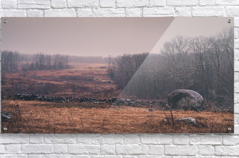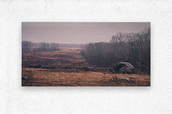 Where ancient stones meet winters dawn Devils Den reveals its quiet strength. The russet-colored grass and weathered rocks tell stories of a battlefield now at peace while morning mist softens historys sharp edges. Natures palette of amber and rose transforms this strategic position into a meditation on times gentle healing.