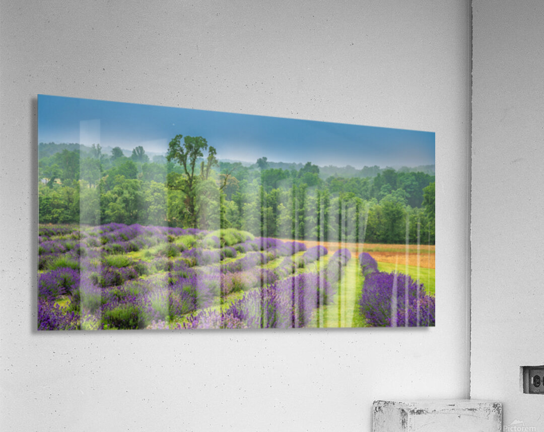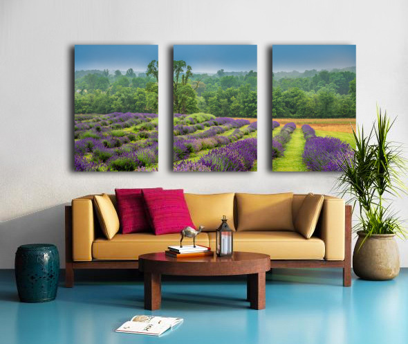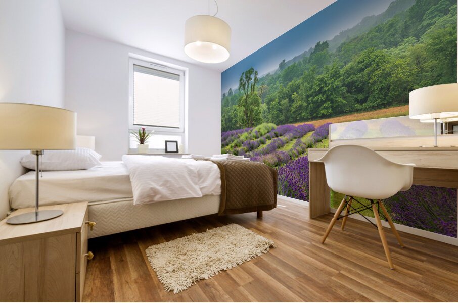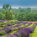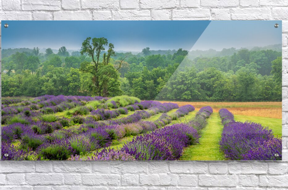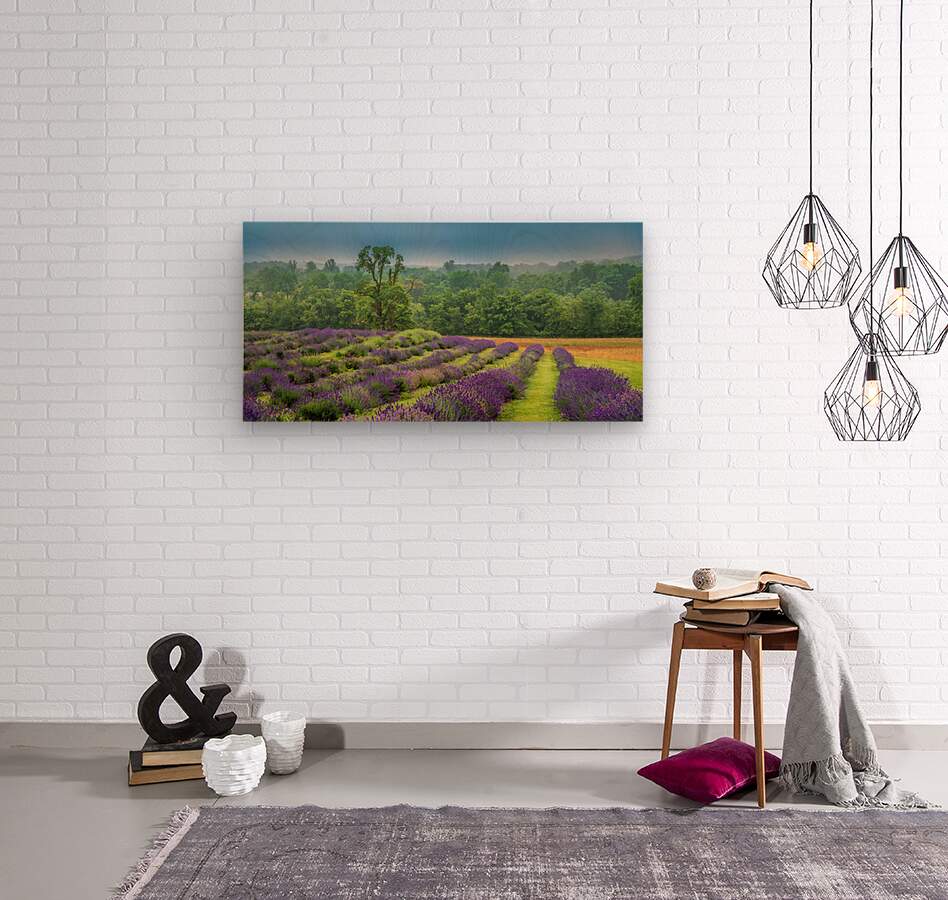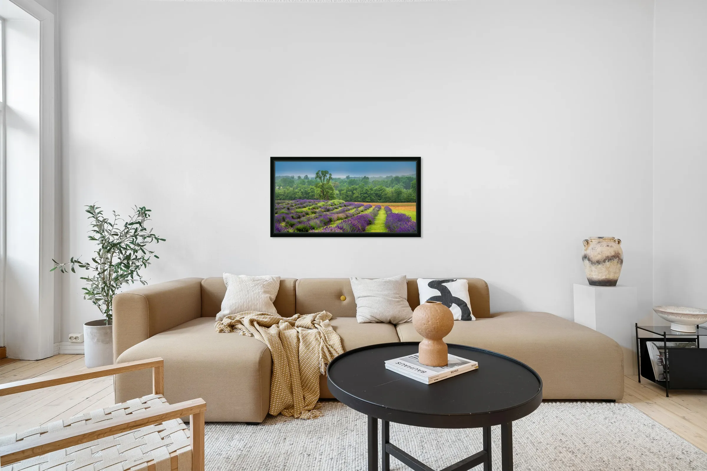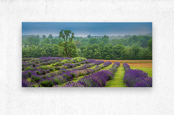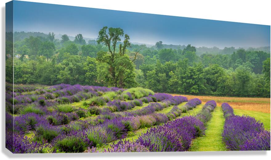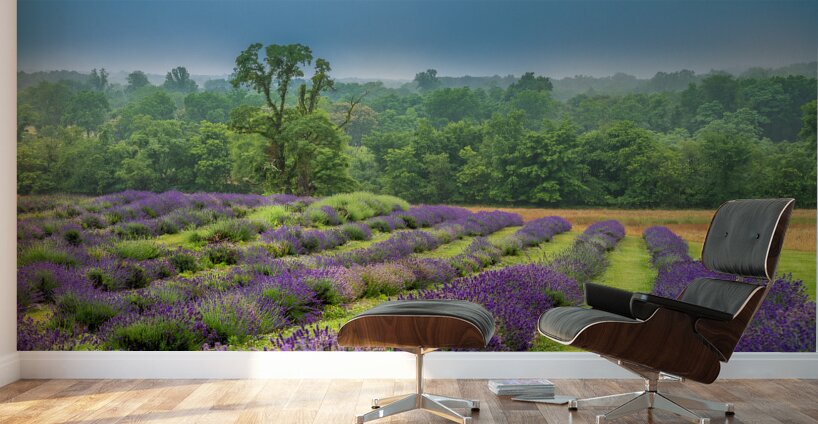 Rows of vibrant lavender dance through the misty morning leading the eye to ancient trees standing sentinel against a moody sky. Natures perfect harmony captured in full bloom.