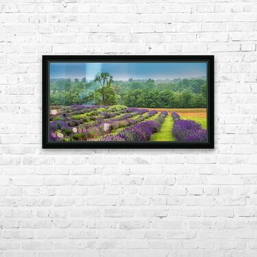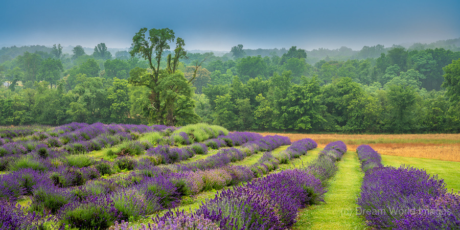 Rows of vibrant lavender dance through the misty morning leading the eye to ancient trees standing sentinel against a moody sky. Natures perfect harmo...[+]