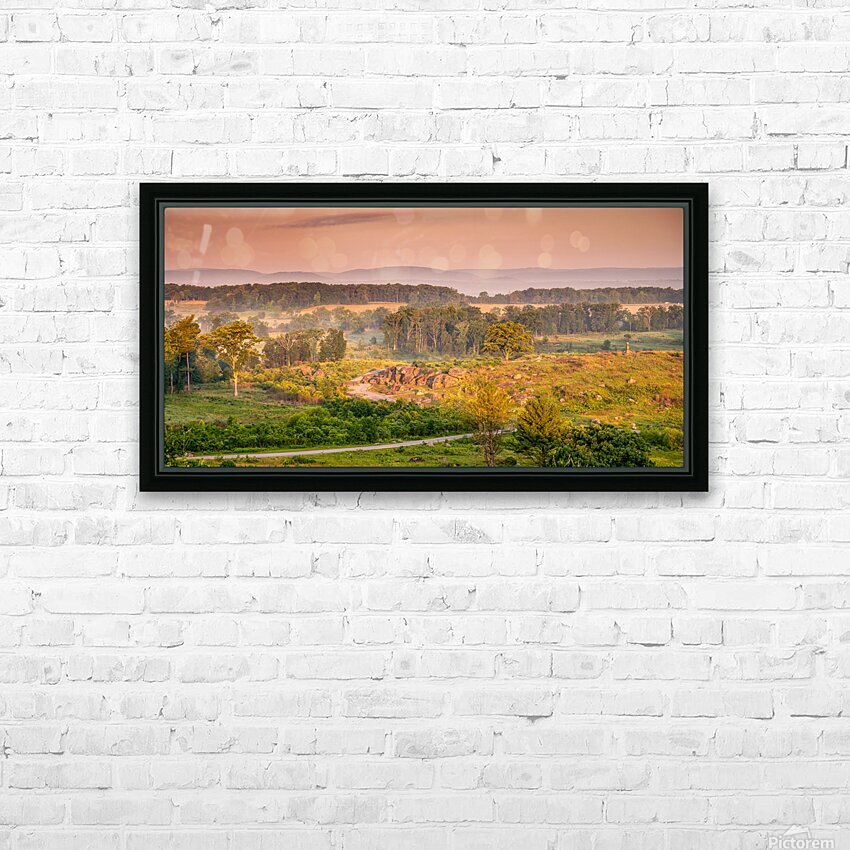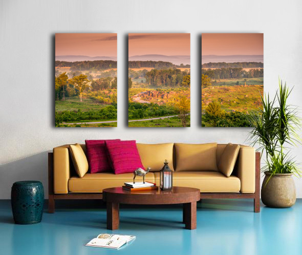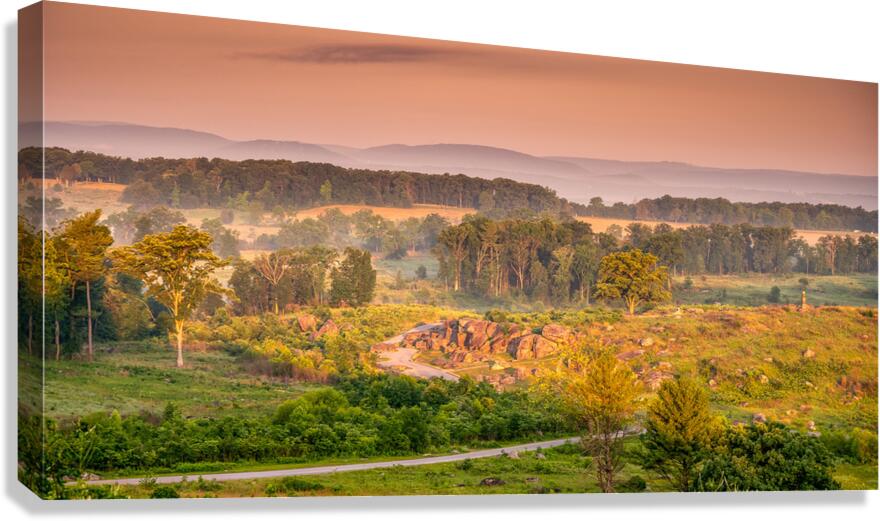 Where history whispers through golden light Devils Den awakens to natures theater. As dawn breaks over Little Round Top storm clouds dance with sunbeams painting this hallowed ground in ethereal amber hues. A moment where time stands still inviting us to witness Gettysburgs eternal beauty in its most dramatic light..