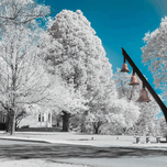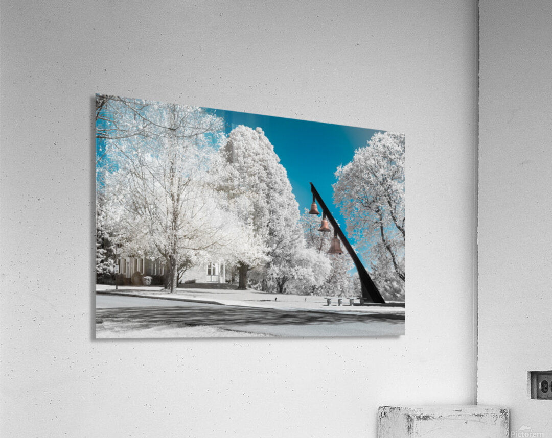 Embarking on a photography adventure I recall the early days when I first delved into the world of infrared imaging. I was captivated by the historic surroundings in Gettysburg sparking a journey of exploration and creativity. One of my earliest infrared images captured the essence of the seminary bells. In this visual story the trees transformed into a bright white standing tall against a canvas of a blue sky. The golden bells nestled on a black bar became a focal point adding a touch of warmth to the scene. As I ventured through the grounds of Gettysburg my camera became a companion capturing unique perspectives and turning familiar landmarks into works of art. The early days of infrared photography marked the beginning of a visual storytelling journey where each image became a memory frozen in time. The seminary bells bathed in golden hues served as a reminder of the rich history and timeless beauty that surrounded me. This early photograph became a testament to my exploration of Gettysburg and the artistic possibilities that infrared photography offered. In the years that followed my journey continued. Still this image remained a cherished memory of the beginnings—an artistic glimpse into the seminarys bells framed by bright white trees a golden melody against the backdrop of a blue sky.