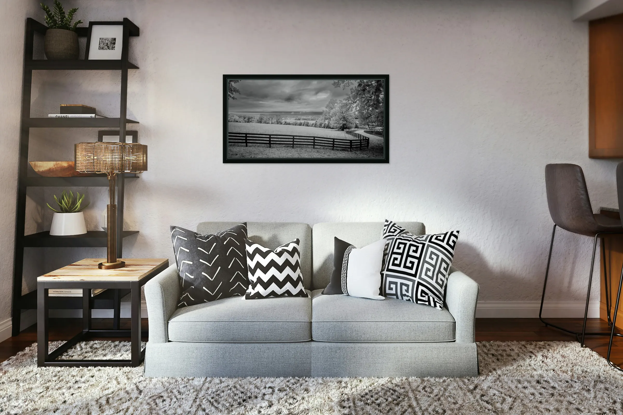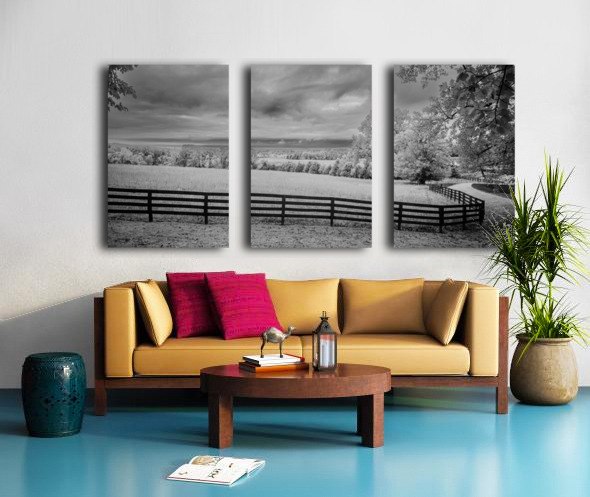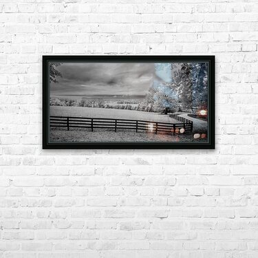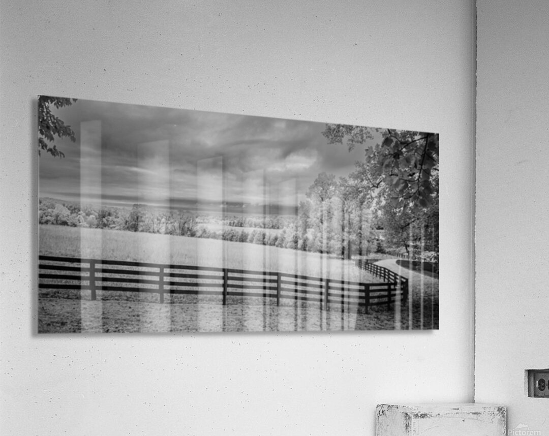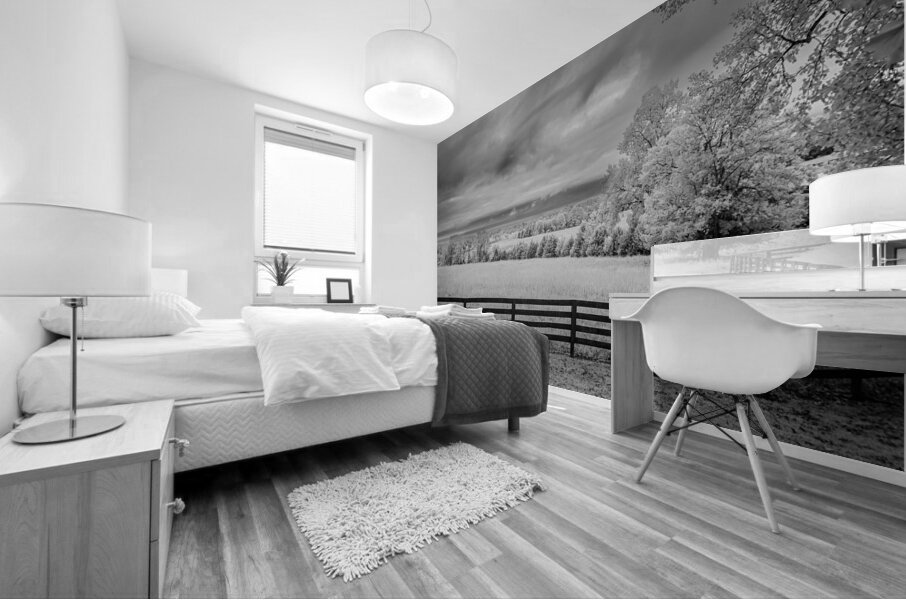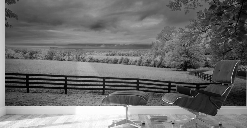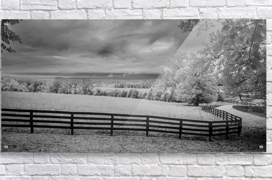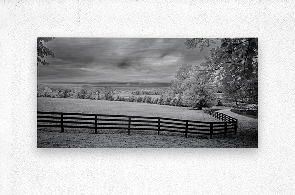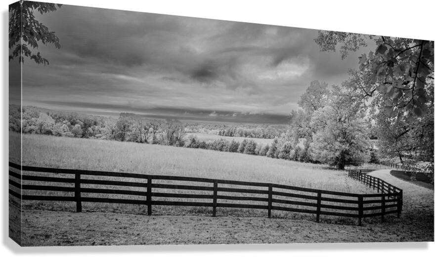 Where pastoral peace meets dramatic skies a simple fence becomes natures frame. In black and white infrared every cloud tells a story every blade of grass whispers secrets and the fence line draws us into a world where light and shadow dance in timeless harmony.