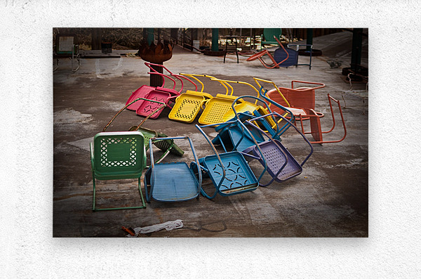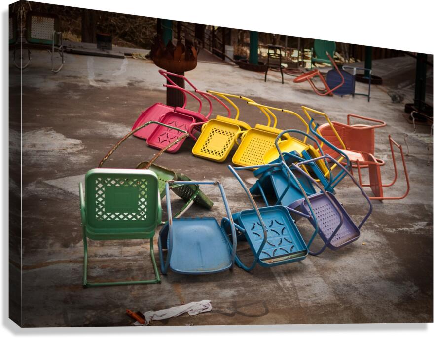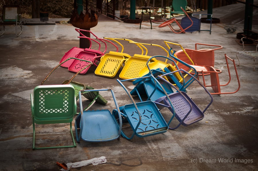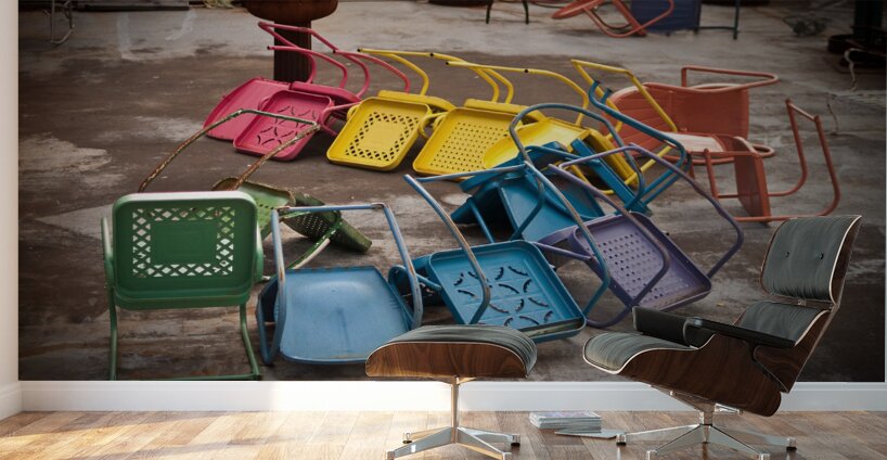 A half circle of colorful chairs with one left upright.