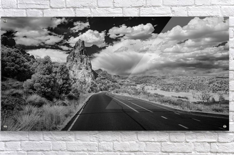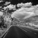 As I wandered through the enchanting landscapes of Garden of the Gods in Colorado Springs an unexpected spectacle unfolded before me. Cresting a small hill I was met with a captivating scene: a winding road leading toward the iconic rock peak that defines the majesty of the garden. The road gracefully turned to the right as it approached the towering formation. Capturing this scenic marvel in a black and white infrared image the photograph beckons viewers to embark on a visual journey titled Roadside Symphony at Garden of the Gods. The road serves as a metaphorical pathway guiding the eye toward the monumental rock peak that stands as the heart of this natural wonder. Adding a touch of drama to the composition a spring storm looms in the distance creating a dynamic contrast against the serene beauty of the garden. The play of light and shadows enhanced by the infrared treatment transforms the scene into a symphony of natures elements. Roadside Symphony at Garden of the Gods invites you to immerse yourself in the harmony of the landscape where the road becomes a narrative thread connecting the observer to the grandeur of the rock peak and the impending storm beyond. Join me on this visual odyssey through one of natures most captivating wonders.