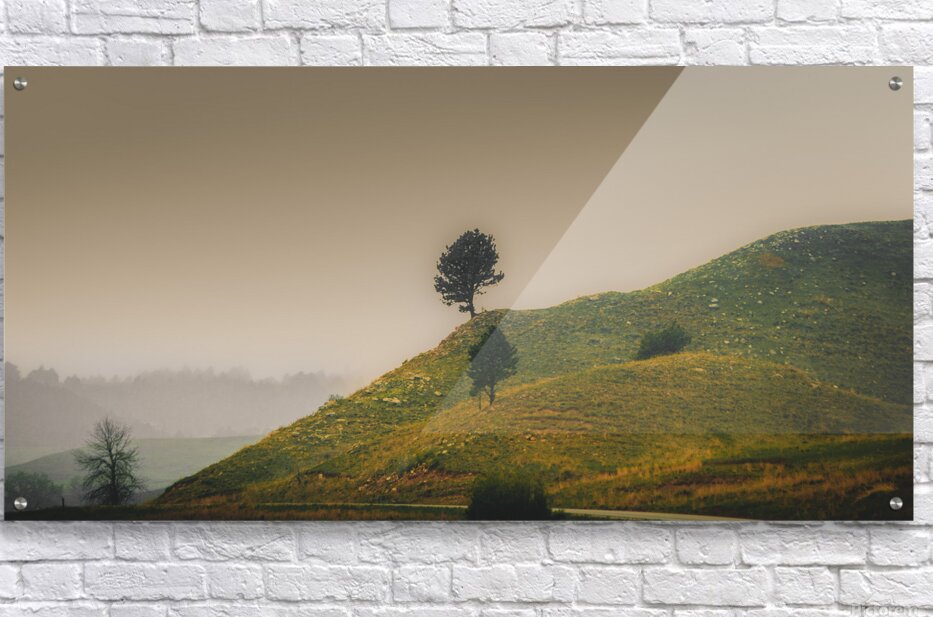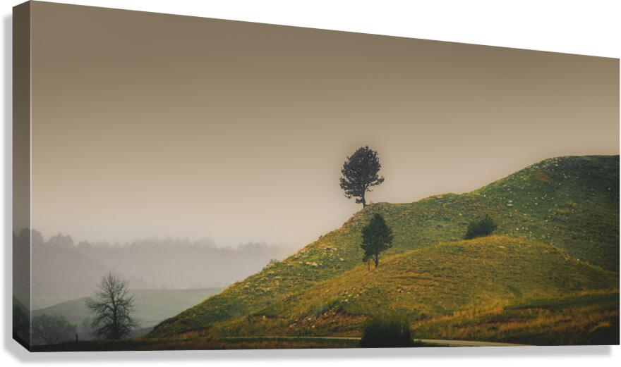Embarking on a scenic drive through the majestic landscapes of Custer State Park in South Dakota I was captivated by a serene scene that unfolded before me—a landscape of tranquil beauty captured in a single photograph. The image revealed two trees standing proudly amidst rolling hills and vast expanses of grass-covered terrain. The larger of the two trees positioned atop a hill served as a distinct focal point against the soft hazy sky its branches reaching skyward in silent reverence. Further down the slope a smaller tree added balance to the composition echoing its counterparts solitude and majesty. As I beheld the tranquil scene I couldnt help but feel a sense of tranquility and isolation wash over me. The subtle palette of earthy greens and browns and the misty background conveyed a profound sense of depth and quietude enveloping the landscape in a veil of serenity. The soft lighting and solitary nature of the trees added to the dreamlike quality of the image transporting me to a realm of surreal beauty and timeless tranquility. In that fleeting moment amidst the untamed wilderness of Custer State Park I felt a profound connection to the natural world around me as if the trees themselves were guardians of the land standing watch over the vast expanse of wilderness. As I continued my journey through Custers wilderness the memory of the solitary sentinels and the tranquil beauty of the landscape stayed with me a reminder of the timeless allure and captivating majesty of the American West.