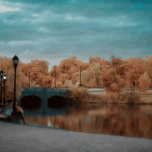 Immerse yourself in the mystical embrace of Reflections of Golden Calm a tranquil photograph that captures the serene essence of an autumnal park. This evocative scene bathed in rich hues of orange and gold unveils a world where time seems to stand still. Majestic trees clad in their autumnal finery stand sentinel by a peaceful body of water. Upon this glassy surface the vibrant foliage and an elegant stone bridge mirror each other weaving a tapestry of duality and reflection. A winding path flanked by vintage lamp posts beckons the observer to journey through this idyllic landscape leading towards the enigmatic bridge that unites both sides of the water. The sky above is a dramatic tableau where a dance of blue and gray clouds adds a touch of melancholy to the serene vista below. The overall imagery evokes a calm and reflective mood inviting the viewer to pause and absorb the profound natural beauty encapsulated within the frame. This piece captures not just a moment but an experience—a deep contemplative breath of natures grandeur forever preserved in a sublime balance of color and light.