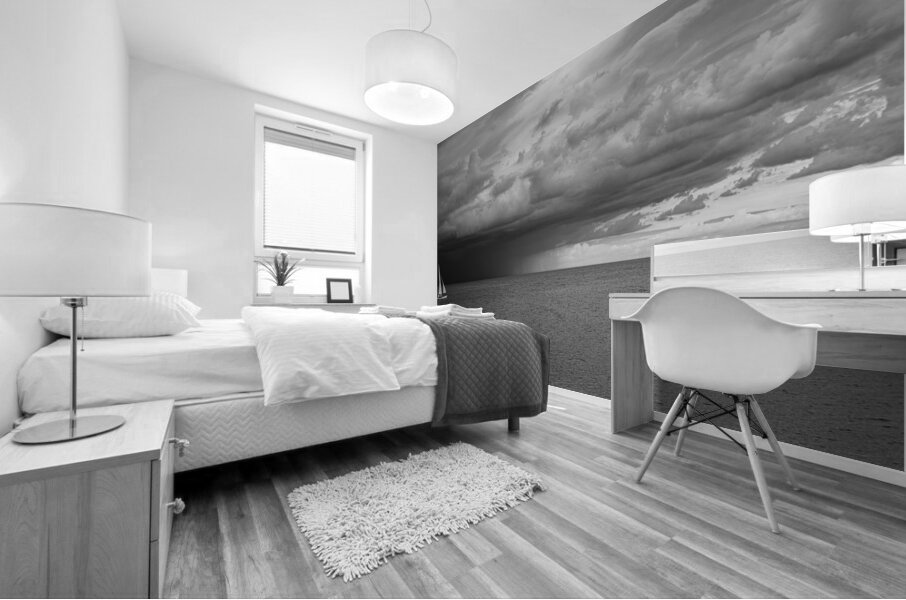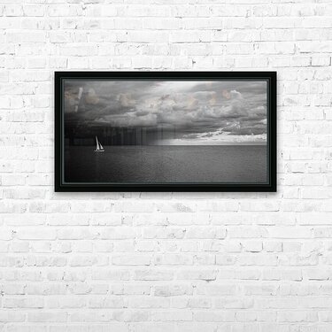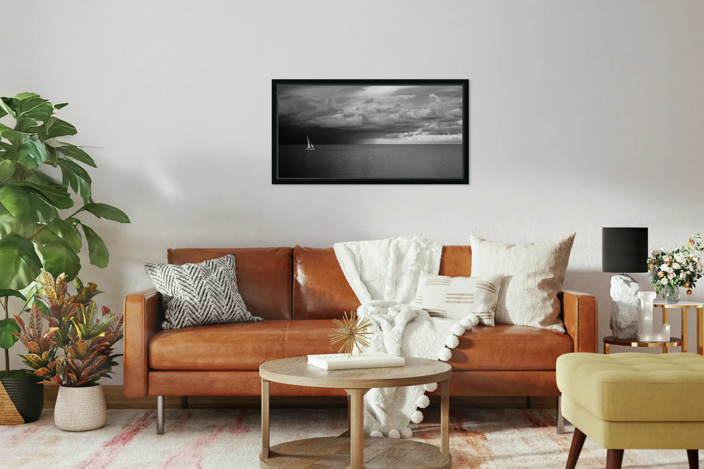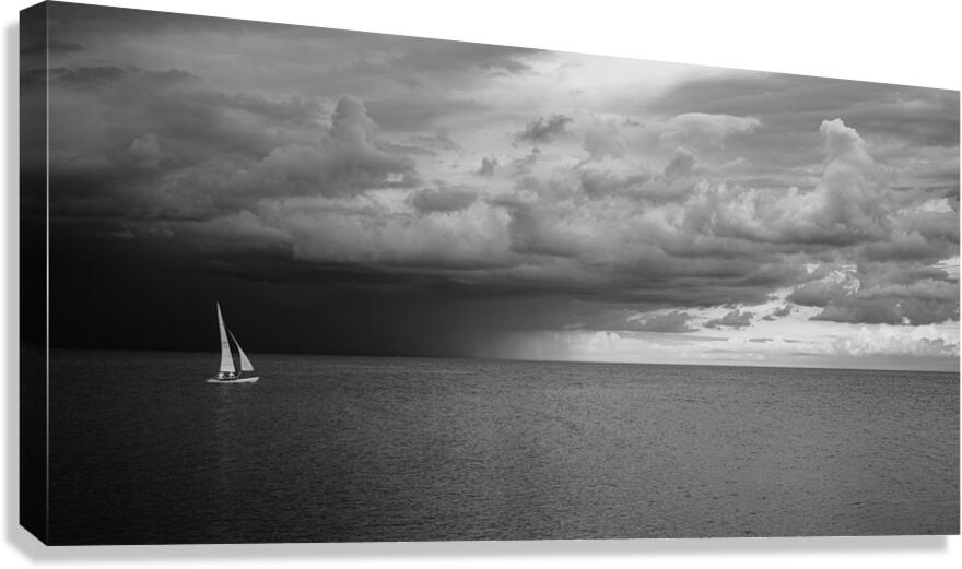 Sailing Beyond the Storms Embrace transports the viewer into a world where the ethereal meets the tangible captured through the enigmatic medium of infrared black-and-white photography. Within the image a solitary sailboat braves an expansive tranquil sea dwarfed by the vastness around it. The composition commands attention to the delicate interplay between light and shadow sculpting a stark contrast that heightens the viewers sense of duality. On one side the horizon broods with ominous clouds whispering of the tempestuous forces of nature while a fragile glimmer of light fights to break through on the other evoking a beacon of hope and solitariness. The scenes profound serenity is underscored by the sense of foreboding that accompanies it offering a space for deep contemplation and introspection. The dance of light and darkness plays out dramatically in the sky casting an almost surreal ambiance over the entire composition. This photograph does not merely capture a moment in time it draws you into a mystical narrative of solitude and resilience inviting the viewer to ponder the vast and often turbulent sea of existence.