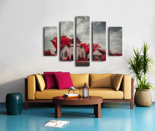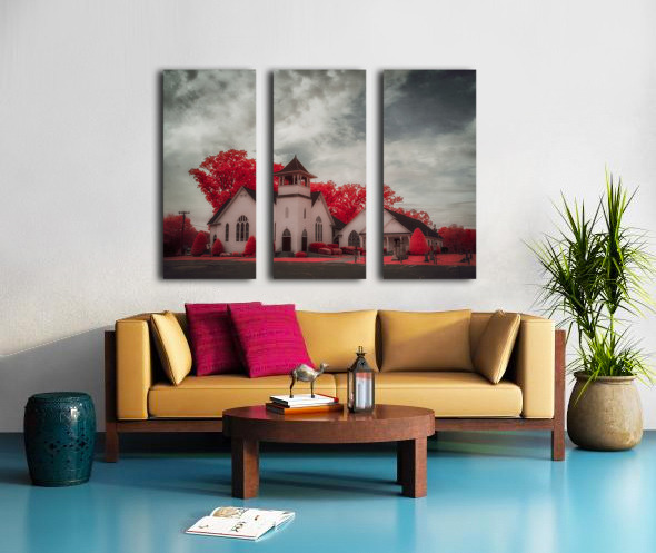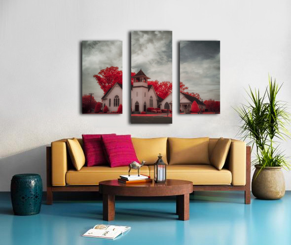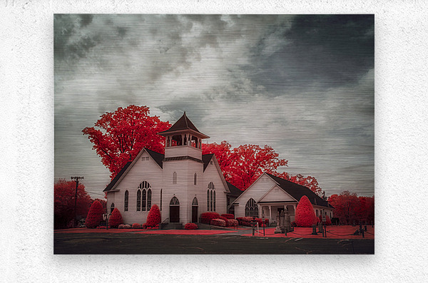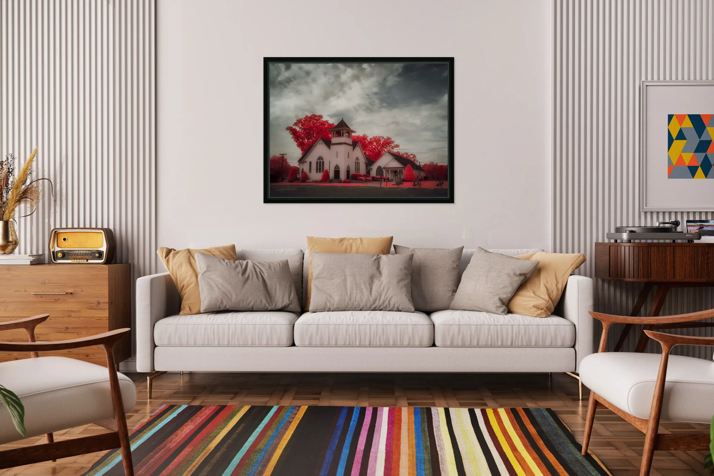 Where sacred meets surreal a white steeple pierces crimson dreams. Through infrareds revealing eye even familiar sanctuaries become gateways to wonder. Some churches dont just reach skyward - they touch imagination.