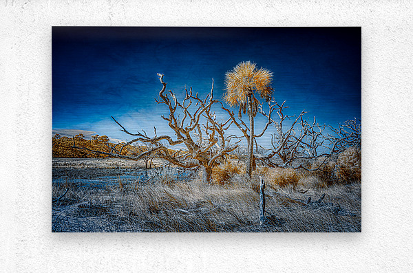 Step into a realm where natures poetry comes alive – witness the haunting beauty of Driftwood Beach nestled on the shores of Jekyll Island Georgia. In this mesmerizing infrared image a scene of ethereal tranquility unfolds before your eyes. At the end of a row of majestic dead trees weathered by time and tides stands a lone palm tree its silhouette striking against the marshy expanse. Like a sentinel guarding over the landscape it stands tall a testament to resilience amidst the elements. Through the lens of infrared photography the world transforms into a surreal dreamscape where reality merges with imagination. In this timeless spectacle hues of infrared breathe life into the scene infusing it with an otherworldly glow that dances across the landscape. Here natures melancholic beauty takes center stage weaving a tale of contrasts and serenity. The juxtaposition of life decay stillness and motion creates a visual symphony that resonates deep within the soul. As you gaze upon this captivating image let yourself be transported to a realm where time stands still and the whispers of the wind carry the secrets of centuries past. Driftwood Beach beckons inviting you to lose yourself in its mesmerizing embrace and discover the profound beauty that lies within. Experience the magic of Driftwood Beach – where every photograph tells a story and every moment is a masterpiece waiting to be captured.