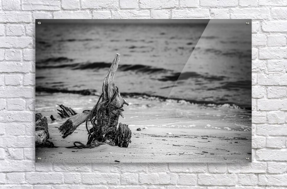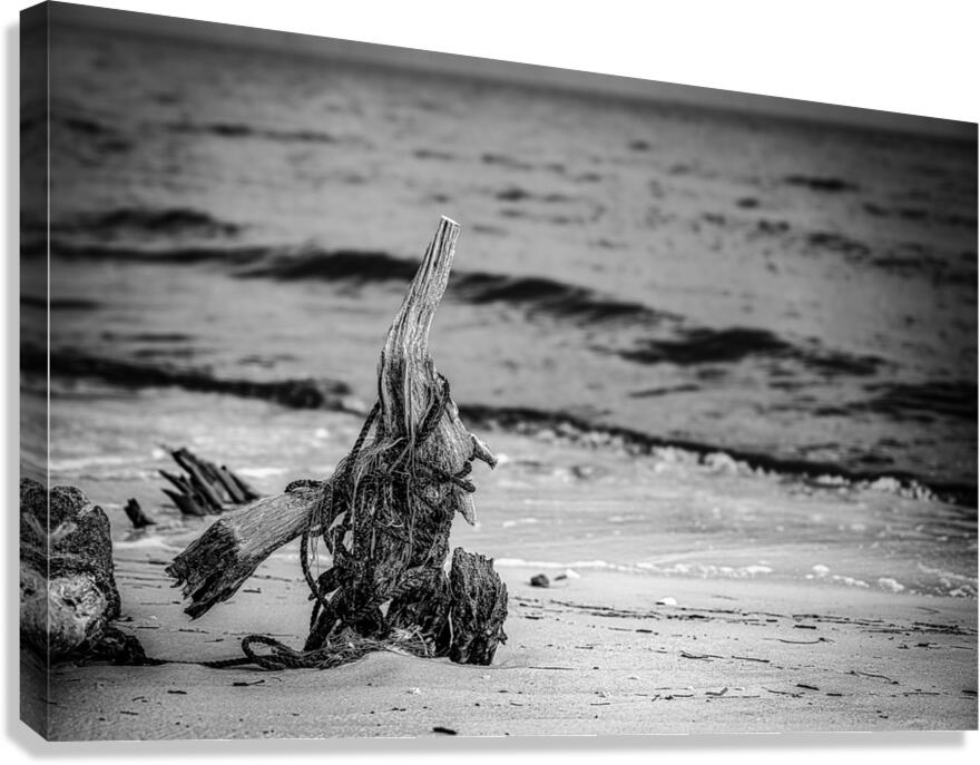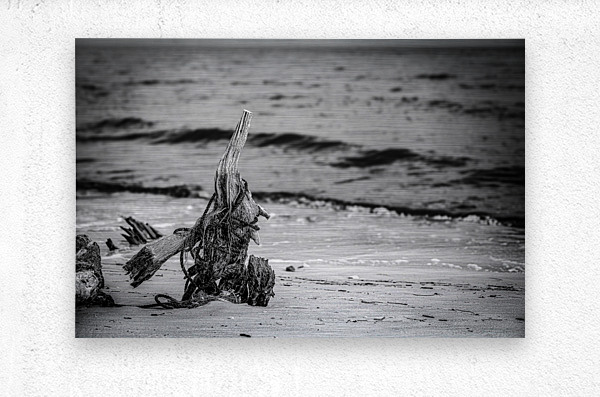 In an enigmatic dance between earth and sea Driftwood Rhapsody on Serene Sands captures a moment of transcendent silence. This photograph immerses the viewer into a timeless embrace where the weathered spirit of driftwood lies gracefully upon the sandy shore. Here natures artistry bears testament to the ceaseless passage of time sculpting the wood into intricate forms woven with invisible stories of its long journey. The monochromatic palette casts a subtle veil over the scene evoking an atmosphere both contemplative and serene. The interplay of textures between the gnarled wood and delicate sands conjures a sense of ancient mystery whispering secrets of the oceans’ depths through the crisp air. At the horizon the gentle expanse of the sea provides a contemplative backdrop enhancing the depth and inviting the soul to wander beyond the visible. This artwork not only captures the essence of nature’s timeless beauty but also invites the observer into a meditative experience. It stands as a testament to the ethereal connection between land and sea suggesting that in each piece of driftwood lies an untold saga a living poem shaped by the elements waiting to be discovered by those who dare to look closer.