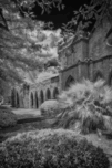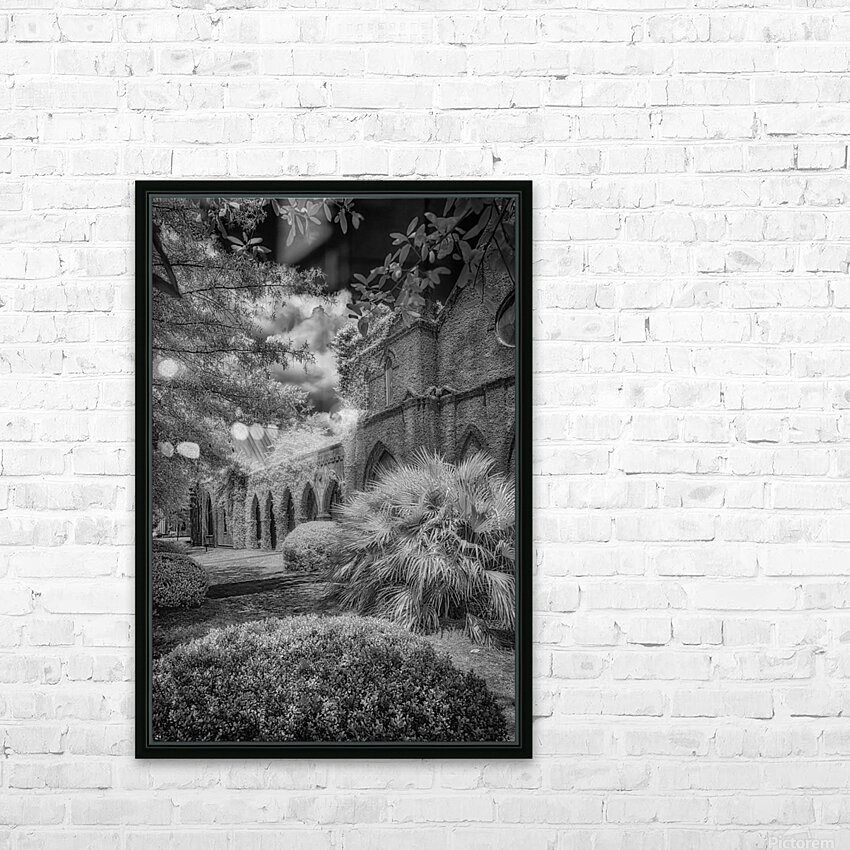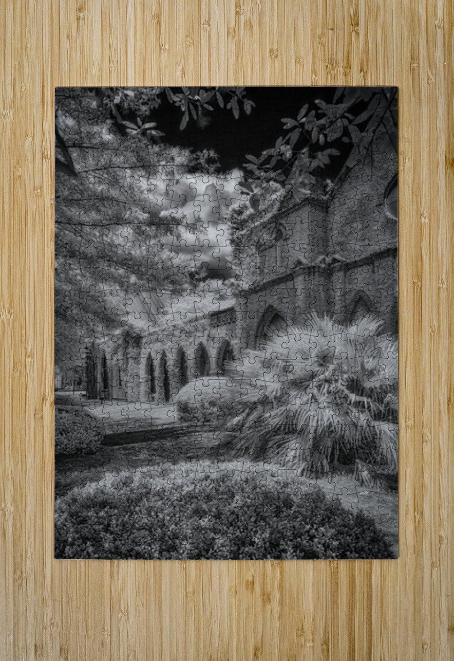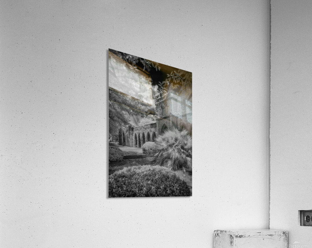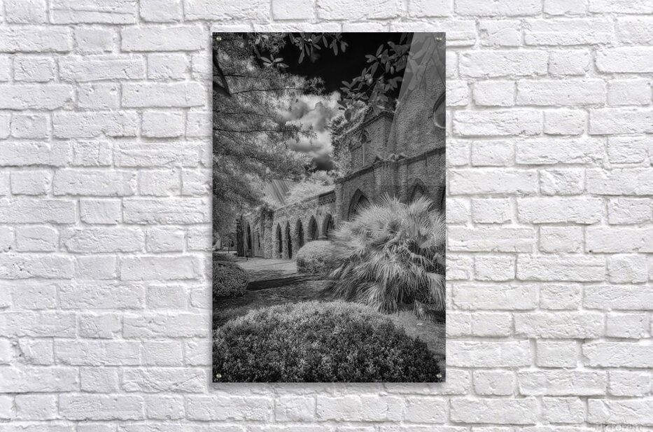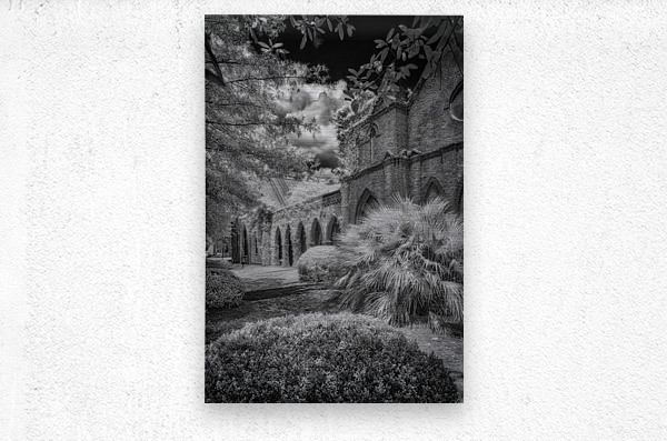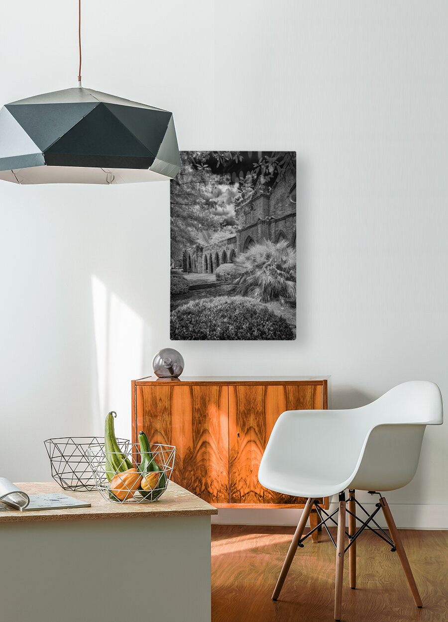 Immerse yourself in the timeless allure of St. James Episcopal Church in the heart of Eufaula Alabama unveiled through the lens of a captivating black and white infrared photograph. This visual journey transcends the ordinary inviting you into an enchanting embrace where the very soul of the church is laid bare. The ivy-covered walls adorned with intricate details become a living canvas as they gracefully unfold in monochromatic splendor. Each tendril of ivy tells a story weaving a tapestry of textures that adds an ethereal elegance to the scene. The play of light and shadow accentuates the architectural nuances bringing forth the churchs history and character in a silent visual symphony. In the foreground a small bush stands as a humble yet significant presence contributing to the composition with its delicate silhouette. Against the stark black sky a dramatic backdrop unfolds serving as a canvas that accentuates the ethereal beauty of St. James Episcopal Church. The dark expanse magnifies the intricate details creating a chiaroscuro effect that heightens the overall atmospheric impact. Nature seemingly with artistic intent positions the surrounding trees to frame the entrance of the church. Their branches extend like welcoming arms adding a touch of mystique to this atmospheric portrayal. The juxtaposition of natural elements against the architectural grandeur creates a harmonious balance transforming the photograph into a visual poem. As you step into this enchanting visual narrative the very spirit of St. James Episcopal Church comes alive. The black and white infrared treatment not only captures the physical form of the church but also reveals its intangible essence. It becomes a portal into a realm where time seems to stand still and the delicate dance of light and shadow narrates the sacred stories etched within the hallowed walls.