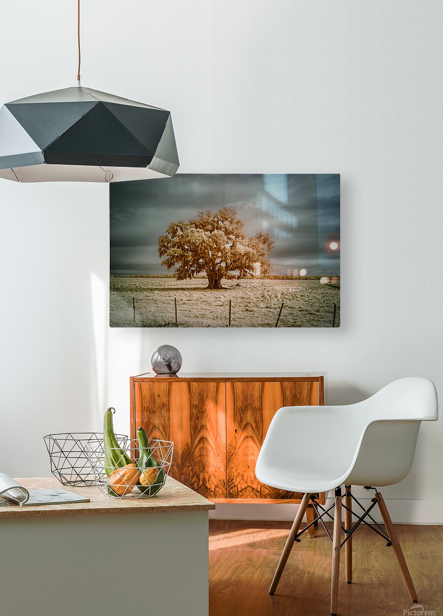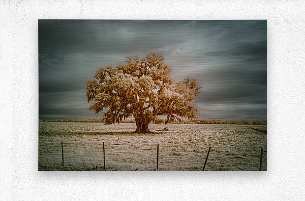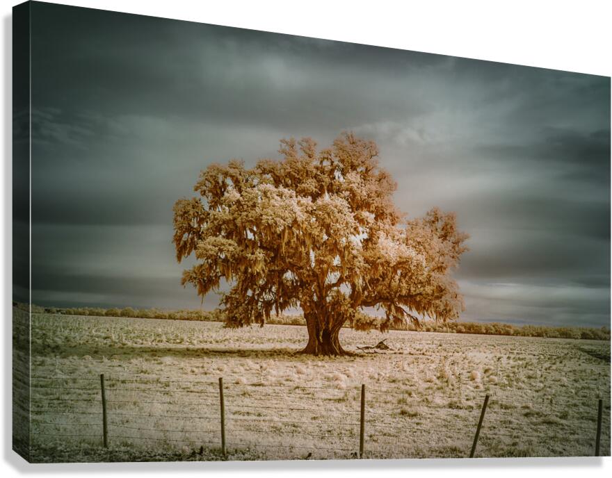Where Spanish moss dances with copper light a lone oak writes its story across the sky. Through infrareds enchanted lens centuries of strength transform into molten gold while storm clouds gather tales above. Some trees dont just grow - they become keepers of time itself. ?