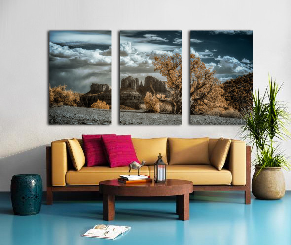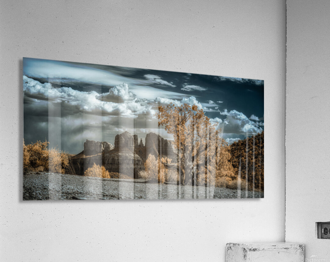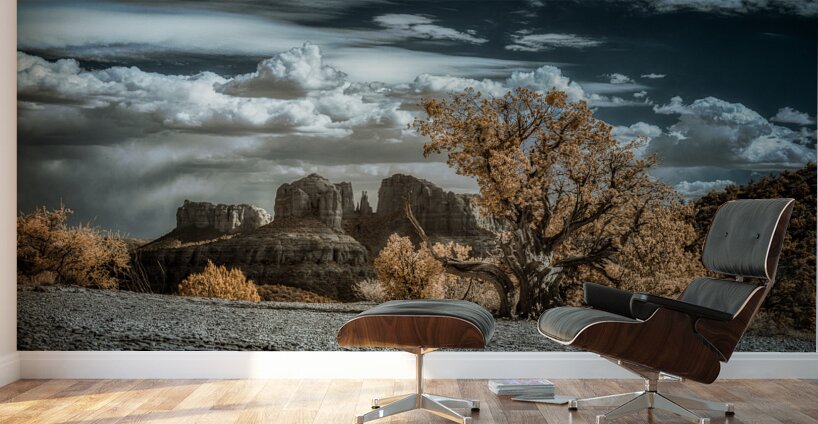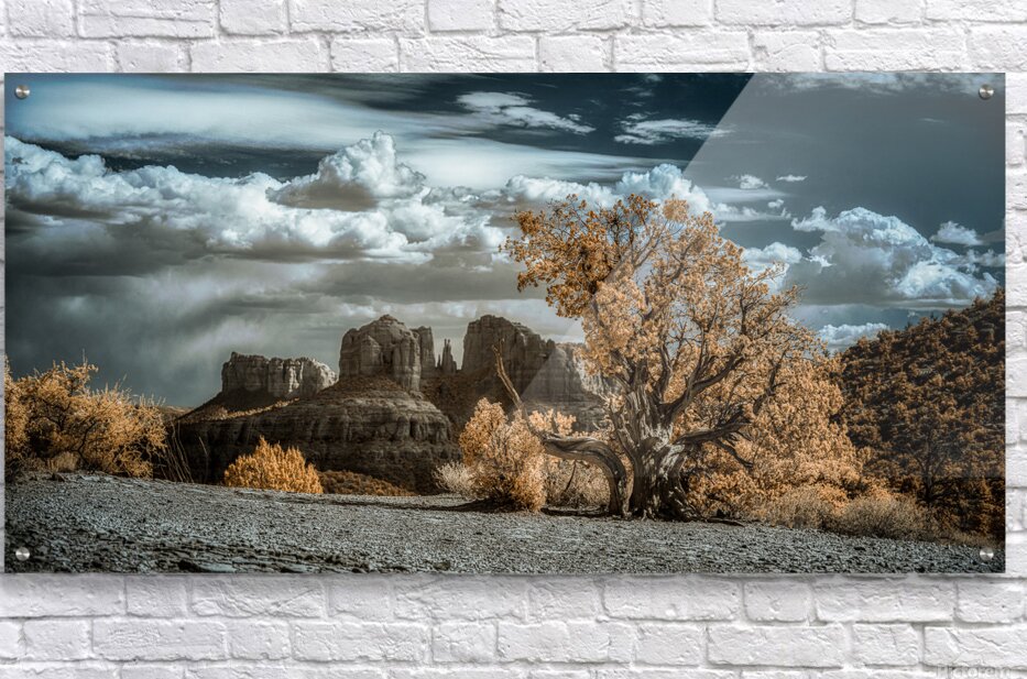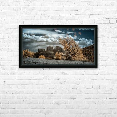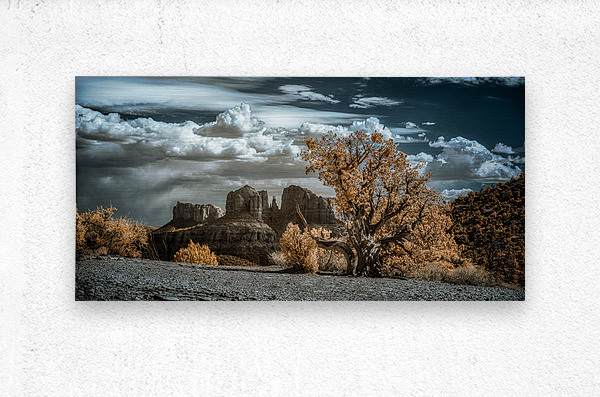 Solitary Desert Dreams captures the enigmatic allure of a hidden landscape where the boundaries between reality and the surreal dissolve into a mesmerizing visual symphony. In this infrared masterpiece a solitary gnarled tree commands the foreground its foliage aglow with an ethereal almost golden luminosity. The tree stands as a sentinel amidst the vast desert expanse whispering tales of resilience and mystery to those who dare to linger in its presence. Behind this arboreal figure dramatic rock formations rise like ancient guardians of a forgotten realm. Their contours are rendered with a stark clarity that contrasts beautifully with the billowing textured clouds overhead. These clouds cast in deep azure hues weave a cosmic tapestry across the sky alluring yet distant inviting ones gaze to wander and wonder. The interplay of warm vegetation against the cool celestial canvas above evokes a sense of dreamlike transcendence. This surreal landscape blurs the lines between the tangible and the imaginary creating a space where natural beauty and otherworldly elements converge. Each glance at this artwork reveals a new story hidden within its depths inviting endless journeys into the mystical heart of the desert.