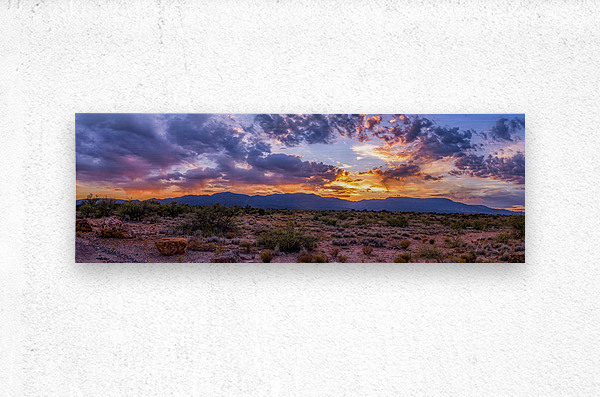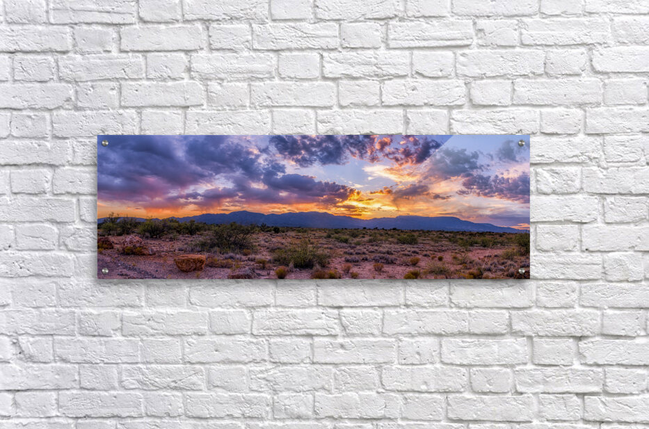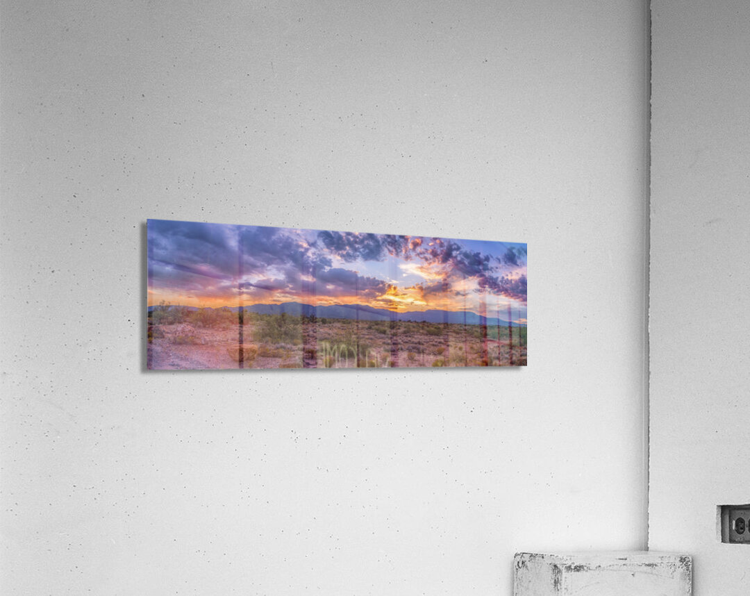 Behold a breathtaking vista where the desert whispers its ancient tales captured in a frozen moment as my wife and I were coming back from the store in Cottonwood Arizona. The sky began to light up and we couldn’t resist pulling over onto a dirt road to capture this image. Sunset Tapestry Over Arid Plains transports the observer to a realm where time seems to pause offering a portal into the soul of the landscape which is as mysterious as it is vast. The photograph unveils a stark yet serene scene where dry grass and scattered bushes are the sole companions in this forgotten sand-laden expanse. As your gaze ventures further low mountains emerge silhouetted against the grandeur of the horizon. The sky above becomes a symphony of colors an ethereal dance of deep blues blending into the warm embrace of oranges and purples. Clouds like celestial beings reflect the suns final farewell with their luminous glow casting a spell of tranquility and majesty upon the world below. This artwork invites you to step into a sanctuary of silence and beauty where the fading day reveals secrets carried by the desert winds. Step closer and let the enchantment of this twilight scene envelop you uncovering stories written into the very essence of the arid yet bountiful plains.