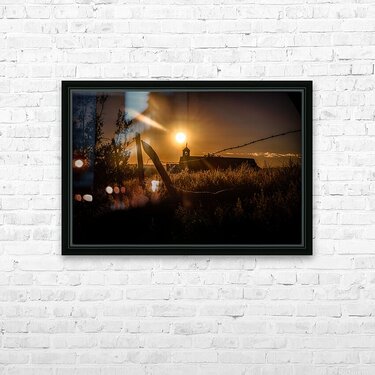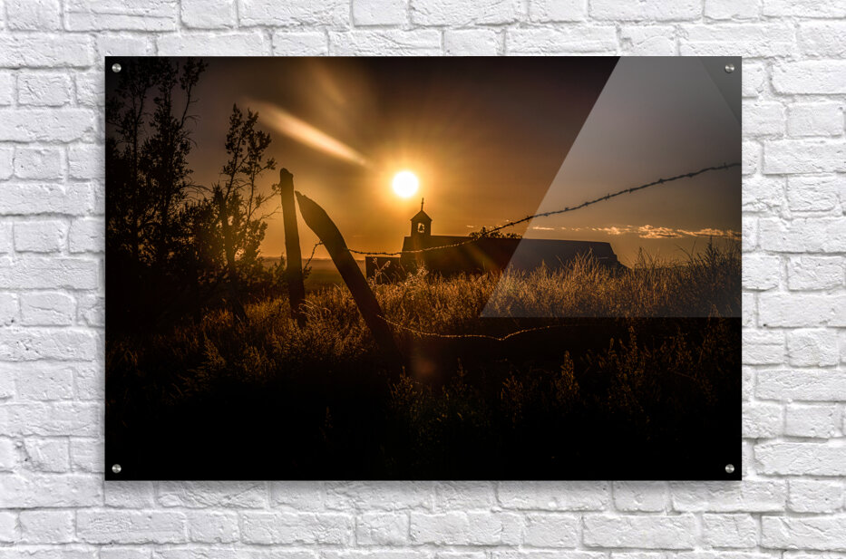 One afternoon my wife and I were on a simple errand to the San Cristobal post office a drive wed taken countless times before. But on the way back something caught our eye—the San Francisco de Asís Catholic Mission Church in Taos. The lighting was absolutely stunning and we knew we had to stop. The sun was low in the sky casting a warm golden glow that felt almost otherworldly as if the heavens themselves were breathing life into the landscape. In this captivating photograph I captured theres a mesmerizing dance between light and shadow painting an enchanting scene. The sun either rising or setting draped the church and the surroundings in a soft ethereal light that illuminated even the quietest corners. A rustic fence is silhouetted against this glowing sky its simple elegant lines evoking a sense of timelessness. To the right the humble church building with its small tower and cross stands subtly yet resolutely. Its form blends seamlessly with the mystical ambiance bringing to life centuries of whispered prayers and quiet moments of reflection. In the foreground the shadowy grasses and untamed vegetation are darkened by the backlit glow of the sun creating a stark yet beautiful contrast. The interplay of light and darkness only deepens the atmosphere of tranquility and solitude. Standing there it felt like a sacred moment where nature and human craftsmanship converged harmoniously and we were fortunate to witness it. The composition captures a serene balance between the natural world and the architecture of the church. The scene is filled with a profound calm urging anyone who looks at it to lose themselves in the beauty of this quiet landscape. In that fleeting moment earth and sky light and shadow all came together to create a space where the soul could reflect on the wonders that exist just beyond the ordinary.