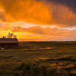 A breathtaking Montana sunset ignites the prairie sky in a blaze of amber and gold, where weathered barn and rustic fences stand silhouetted against n...[+]