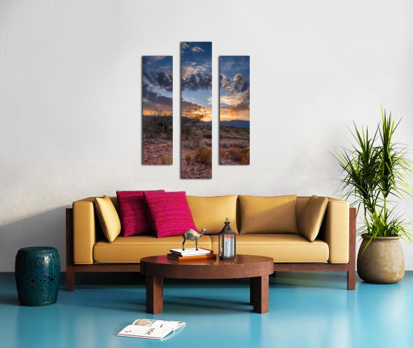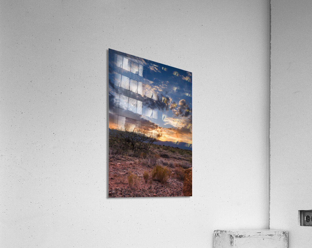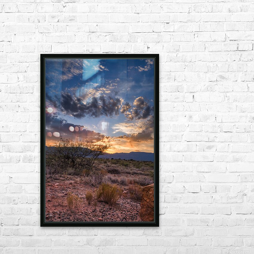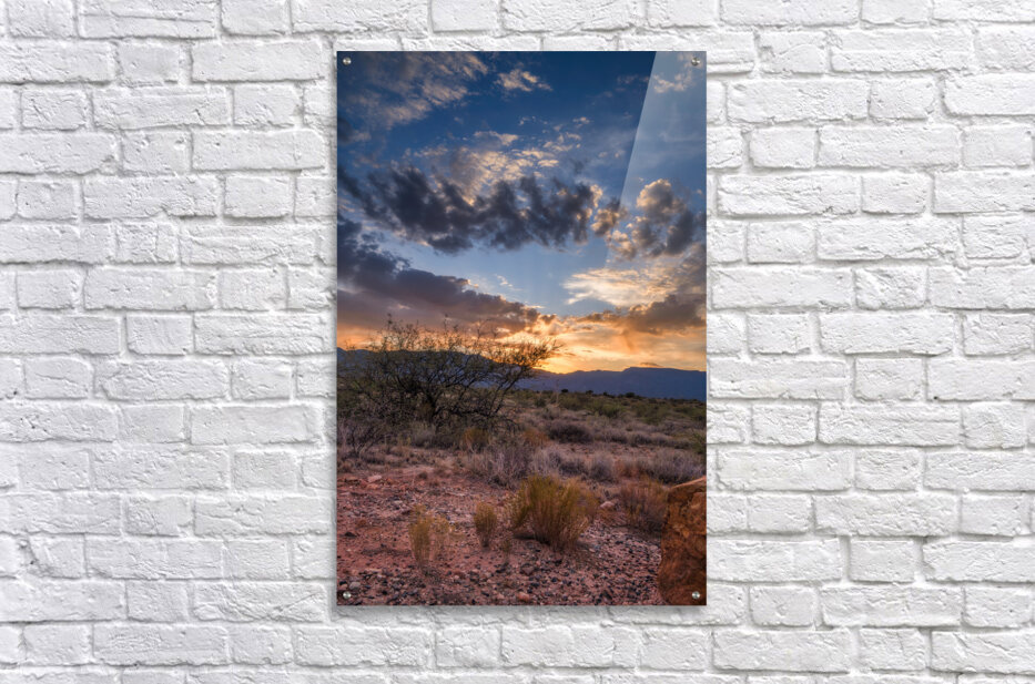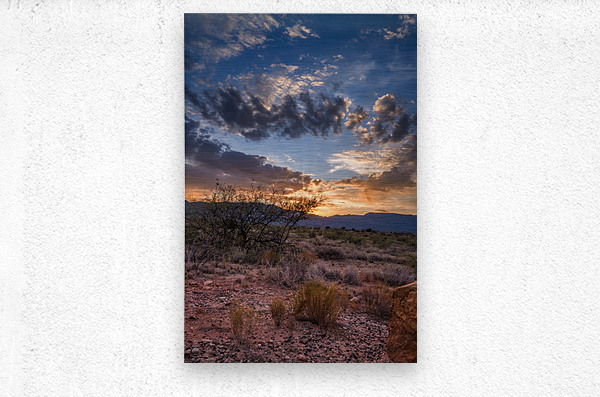 Radiance Unfurled Over Rocky Plains beckons the viewer into a realm where earth meets sky in an ethereal embrace. My wife and I were driving back from the store in Cottonwood Arizona when the sky started to light up in the most spectacular way. We couldn’t resist so we pulled over onto a dirt road to capture this image. This captivating photograph unveils a desert landscape cloaked in the mystique of twilight. In the foreground rugged dry shrubs and the rocky terrain stand as silent sentinels guardians of an ancient and untamed wilderness. A solitary tree resolute against the encroaching dusk reaches skyward framed by the distant shadowy grandeur of mountains that whisper secrets of time immemorial. Above the heavens unfold in a mesmerizing dance of light and shadow. Dramatic clouds gather at the horizon woven with threads of golden and fiery orange as the sun surrenders its radiance to the encroaching night. Piercing through this celestial tapestry luminous rays of sunlight stream defiantly through the cloud cover casting a divine glow that pierces the deepening blue canopy. This interplay creates a powerful contrast evoking a sense of wonder and the infinite. The piece captures the transient moment when day bows to night encapsulating the profound beauty and mystery of natures fleeting spectacles. Its an invitation to wander into the wild heart of the world and to lose oneself in the enigmatic beauty of the unseen. Radiance Unfurled Over Rocky Plains stands as a testament to the awe-inspiring duality of earth and heavens encouraging the beholder to find their own place within this eternal saga.