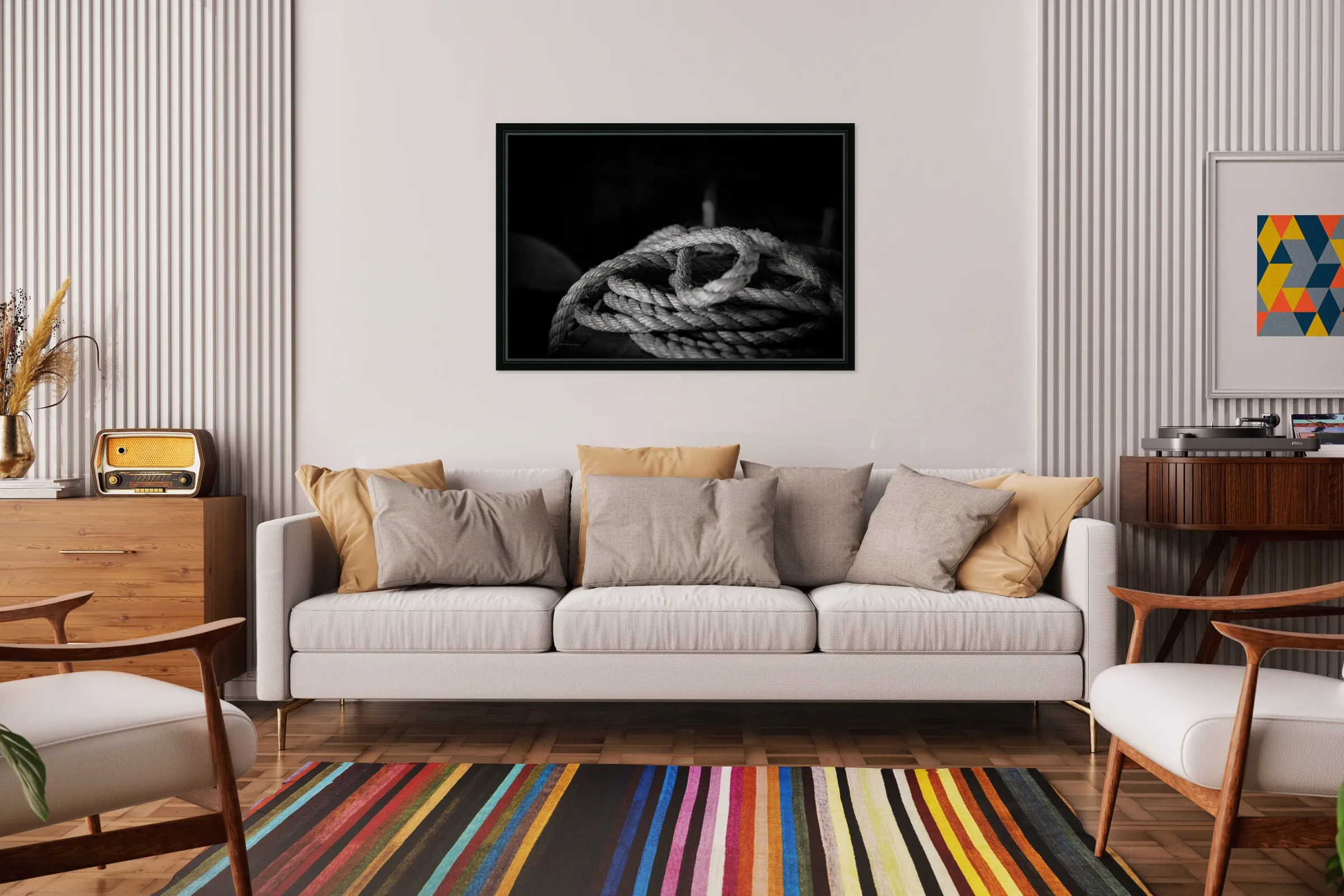 Tangled Luminescence enchants viewers with its mystical interplay of light and shadow transcending ordinary perception. This monochromatic photograph captures the viewers imagination with its ethereal depiction of a coiled rope each fiber meticulously highlighted in stunning contrast. The composition is a delicate dance of texture and detail where the ropes intricate weave becomes a vessel for introspection and contemplation. As the light caresses the curves and knots of the rope a realm of mystery unfolds. The dark background amplifies the dramatic essence of the scene creating an atmosphere heavy with questions and quiet revelations. In this visual narrative the rope emerges not just as an object but as a symbol of interconnectedness and enigma inviting viewers to explore the hidden stories woven within its spirals. Through its intense yet subtle visual poetry Tangled Luminescence beckons the beholder to unravel its secrets one strand at a time.