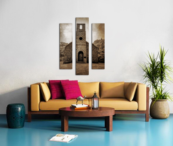 Stone Guardian of Forgotten Eras emerges from the mists of time in an infrared sepia-toned photograph capturing the essence of an ancient sentinel. A small rustic stone building stands at the heart of the piece its arched entryway and twin circular windows whispering secrets of the past. Rising with quiet strength a square tower pierces the sky its peak adorned with an arched void that hints at watchful eyes no longer present. The texture and color of the photograph cloak the scene in a velvety antiquity drawing the viewer into a realm where history and memory intertwine. The blurred background of whispering trees and an overcast sky adds layers of mystery and a dreamlike atmosphere as if this sacred structure guards the threshold between worlds. The image evokes a profound sense of nostalgia and reverence for eras long faded urging the observer to ponder the stories and whispers echoing through the stone. Each element from the commanding architecture to the ethereal aura invites one to step beyond the veil of the present and commune with the timeless spirit that resides within.