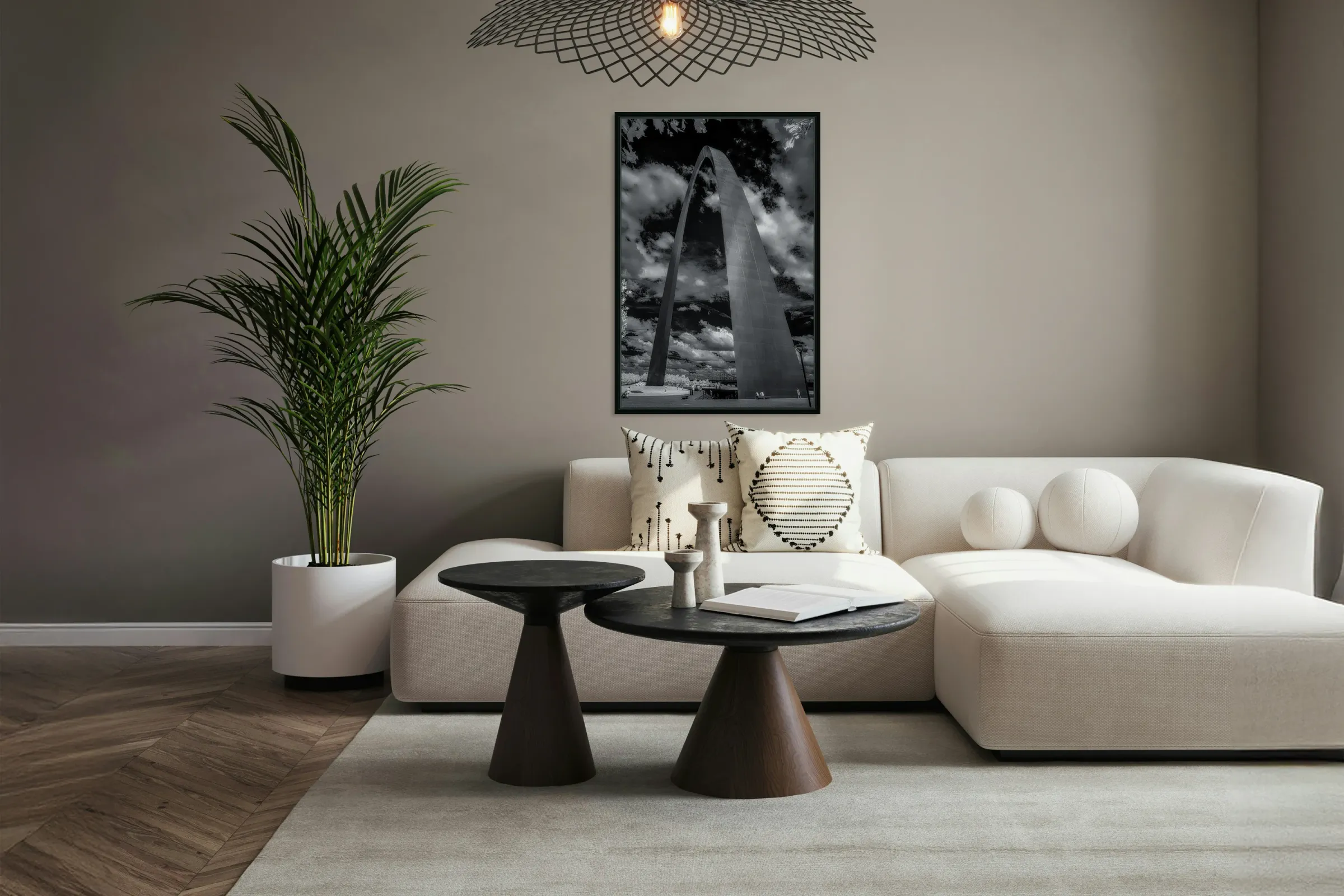 The image captures the awe-inspiring beauty of an iconic arch that reaches majestically into the heavens. This striking infrared photograph is a masterpiece that combines elements of architecture and natural splendor. Rendered in black and white the image reveals a play of shadows and highlights bringing the smooth sleek lines of the arch into sharp focus. The dramatic clouds that spread across the sky add a textured backdrop enhancing the sense of scale and grandeur of the imposing structure. In this powerful composition every line and curve of the arch is imbued with a sense of purpose and elegance. The photograph not only freezes a moment in time but also evokes a feeling of limitless potential and upward aspiration. The juxtaposition of light and shadow creates depth making the monument appear even more formidable and impressive. This artwork serves as a testament to human achievement and the boundless possibilities of reaching ever higher.