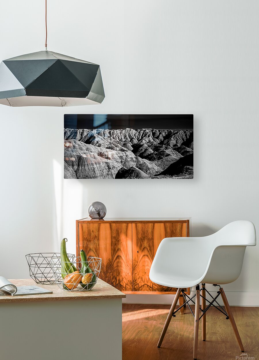 Embark on an unforgettable adventure as my wife and I journeyed through the captivating landscapes of the Badlands in South Dakota. Witness the breathtaking beauty of this rugged terrain where every shadow tells a story of mystery and intrigue. Step into a world where the shadows dance across the rugged earth revealing a landscape shrouded in enigma. The realm of sharply ridged hills and deep valleys is illuminated by a captivating play of light and shadow bringing texture and depth to every crevice. The horizon stretches endlessly beckoning the viewer to explore beyond the intricate patterns carved into the earth. In a black and white photograph that captures the essence of the lands ancient soul this artwork invites you to lose yourself in the Shadows of the Earth.