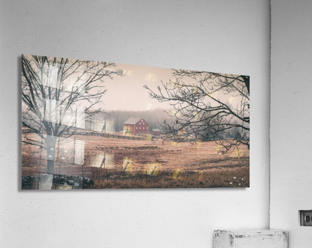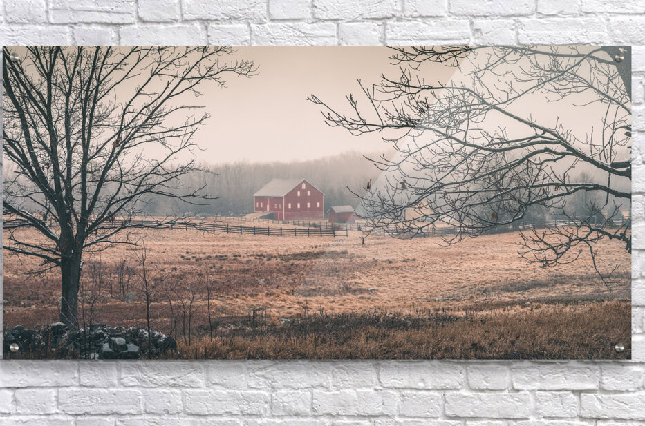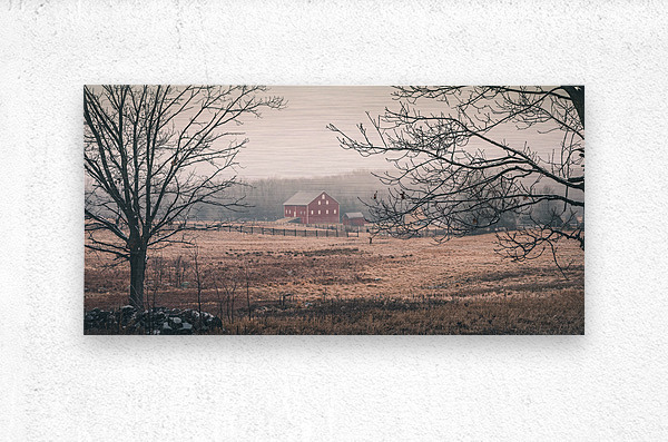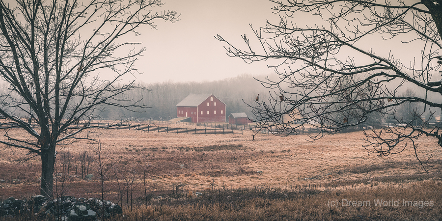 Through winters gentle veil a historic Gettysburg barn stands in quiet dignity its weathered red walls glowing like russet silk in the morning light. Framed by bare winter branches and embraced by mist this peaceful scene invites us to pause and reflect on the delicate balance between preservation and times passage.