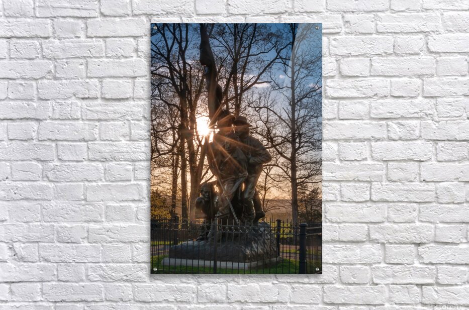 Step into a world of valor and resilience with this captivating artwork titled Stand Together Move Forward. The bronze statue stands tall depicting a group of military figures united in solidarity against all odds. The intricate details of their uniforms and expressions convey a sense of camaraderie and unwavering determination. As the sun casts its warm glow over the scene the figures come to life seemingly ready to take on any challenge that comes their way. The play of light and shadows adds depth and dimension to the sculpture enhancing its powerful presence. Surrounded by a sturdy metal fence the artwork stands as a symbol of strength and protection amidst lush trees and an expansive sky. The juxtaposition of the figures against the natural elements creates a striking contrast emphasizing the bravery and companionship depicted in the piece. Experience the beauty and poignancy of this stunning artwork where valor and unity reign supreme. Each viewing offers a new perspective inviting viewers to reflect on the resilience and sacrifice of those who stand together in the face of adversity. Stand Together Move Forward is a testament to the human spirit and an homage to the unbreakable bond forged through shared experiences.