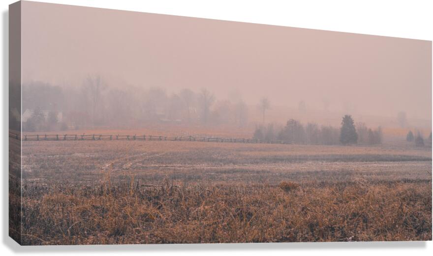 Dawn mist embraces Gettysburgs hallowed ground where a historic split-rail fence stretches across winter-worn fields. In this gentle morning light time seems to pause allowing us to witness the battlefield as it might have appeared over 160 years ago. Natures quiet reverence perfectly captures the solemnity of this sacred space.