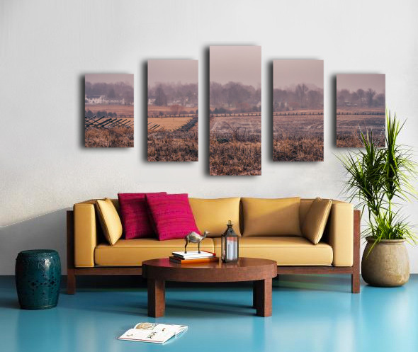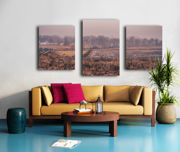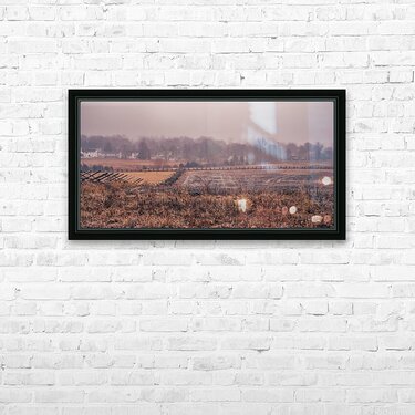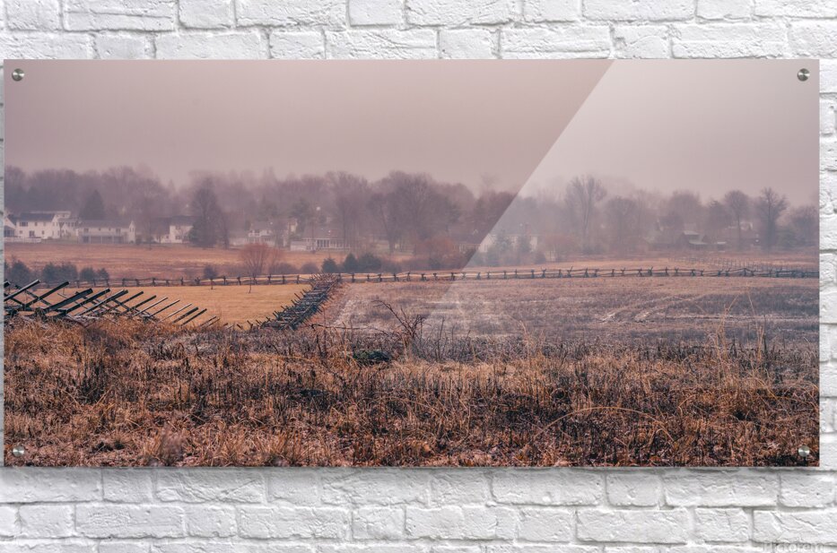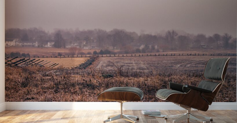 Where past meets present along Gettysburgs historic line a split-rail fence weaves through winter-worn fields like a wooden thread through time. The morning mist softens modern homes into ghostly shapes while the iconic fence - a reproduction of those that guided troops in 1863 - stands as both barrier and bridge to history. Nature paints this dawn scene in gentle oatmeal tones reminding us that even on hallowed ground life continues its quiet march forward.