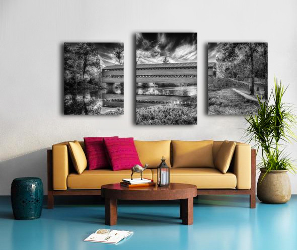 Where history meets reflection, this covered bridge creates perfect symmetry with its mirror image in still waters below. Through monochromatic artistry, the dramatic sky and classic architecture combine to tell a story of American heritage, while every weathered board and ripple adds to the temporal dialogue. This capture transforms a historic landmark into a meditation on preservation and natural beauty.