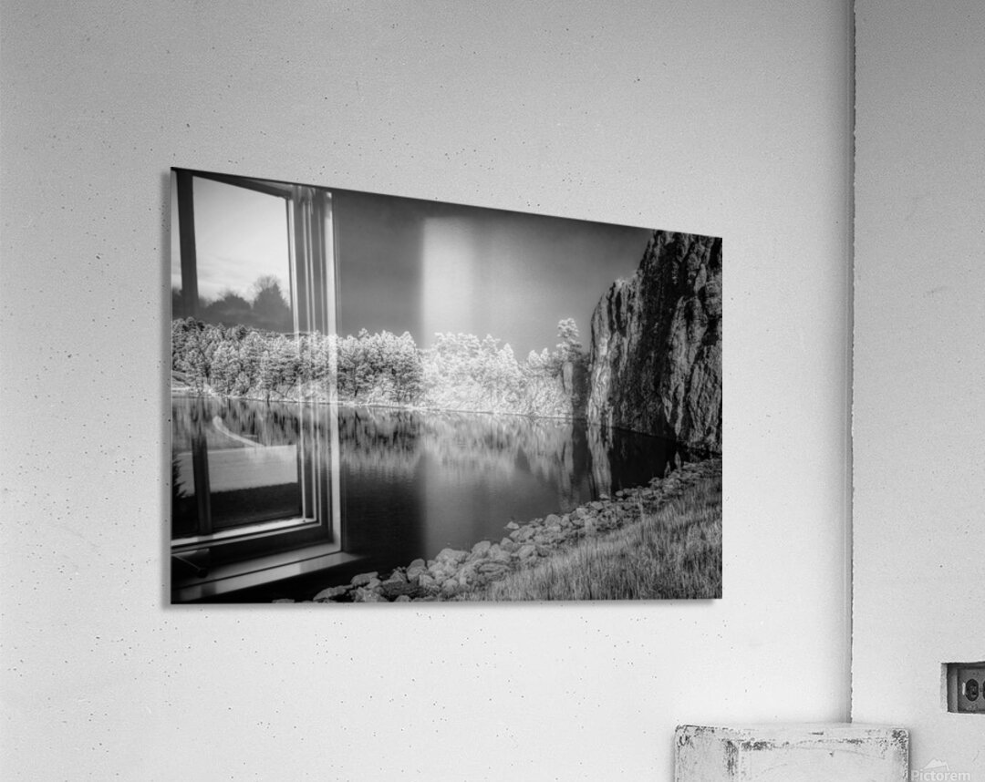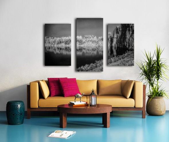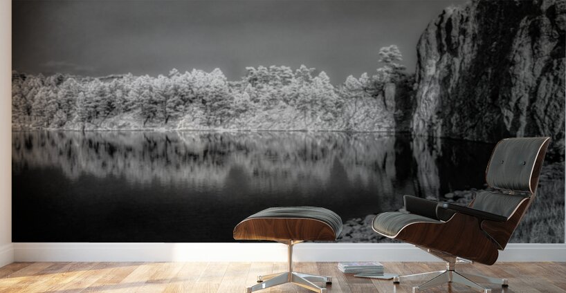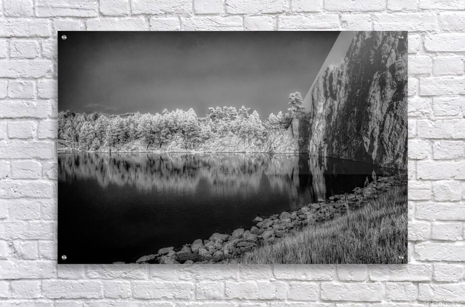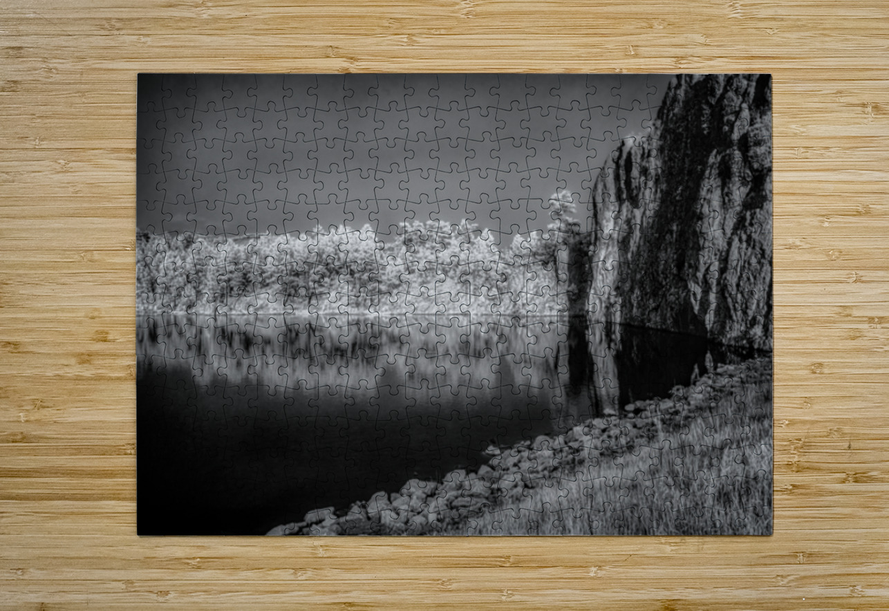 Step into a world of enchantment with this captivating piece titled Legion Reflections. The black and white photograph transports you to a tranquil oasis where natures beauty is reflected in a serene body of water. Lush trees dance along the waters edge their leaves whispering secrets of the forest. A majestic rocky cliff stands guard a silent sentinel against the passage of time. The intricate details of grasses and stones add depth to this mystical landscape inviting you to lose yourself in its enigmatic allure. Allow yourself to be transported to a place of peace and reflection as you explore the hidden depths of Legion Reflections.