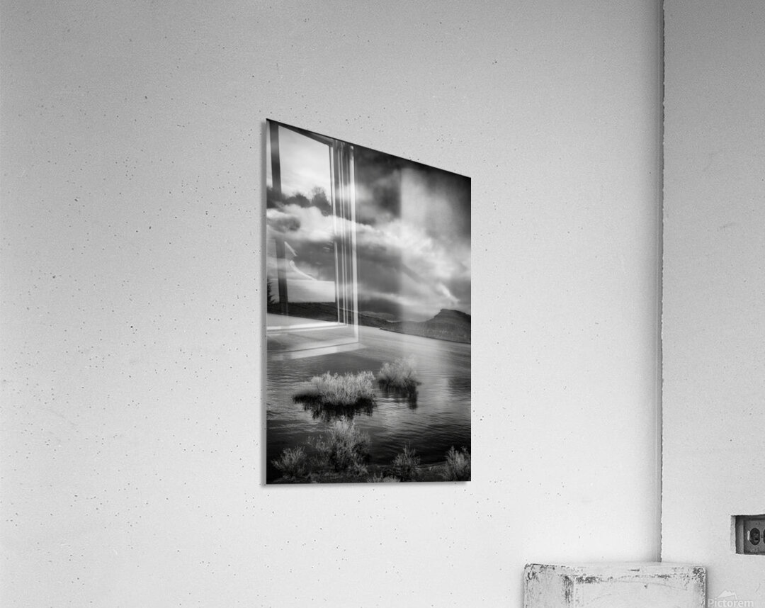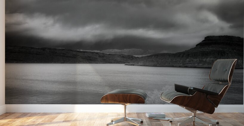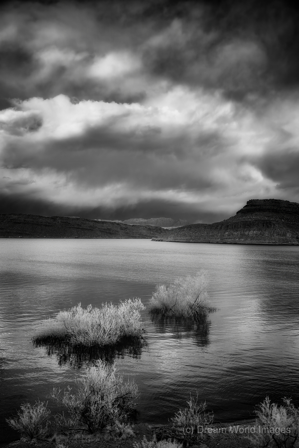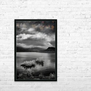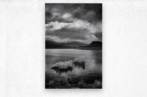 Through monochromatic artistry desert reeds glow like silver sentinels against dark waters while storm clouds dance above distant mesas. This contemplative study captures the dramatic dialogue between sky and water where every ripple and cloud tells its own story of desert wilderness. The composition transforms a simple lake scene into a meditation on natures contrasts where light and shadow paint their eternal dance.