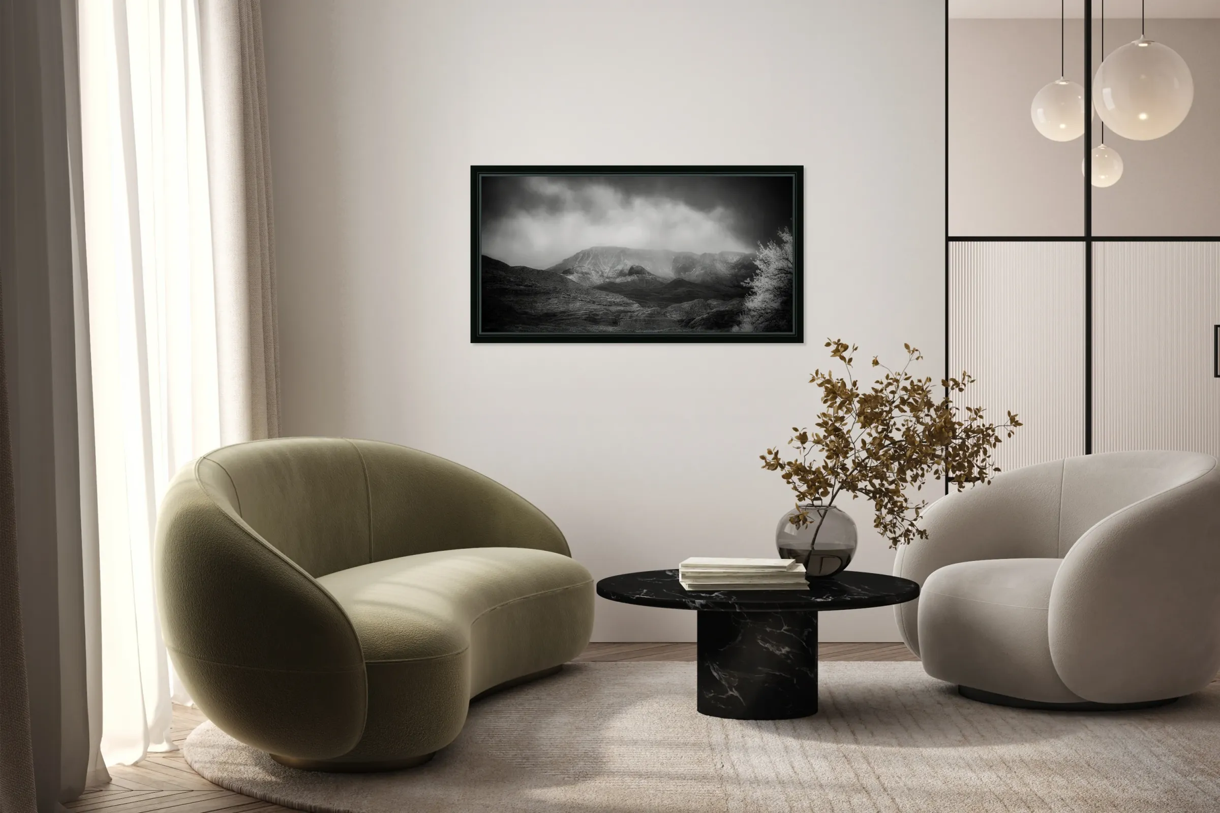 Through black and white artistry winter-touched peaks emerge from swirling storm clouds creating a timeless meditation on natures grandeur. This dramatic study captures the eternal dialogue between mountain and sky where every ridge and shadow tells its own story of wilderness. The composition transforms rugged terrain into a contemplative journey inviting viewers to witness the raw poetry of storm-swept peaks.
